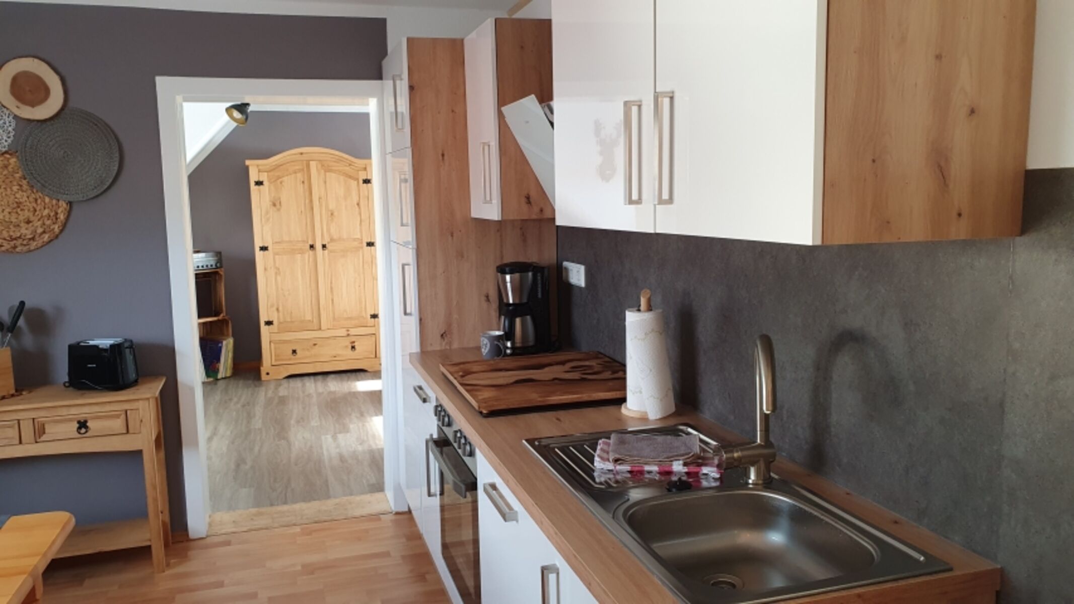 Cerankochfeld, Dunstabzugshaube, Kühlschrank mit Gefrierfach, Gefrierschrank, Eierkocher, Korkenzieher / Flaschenöffner, Gewürze (Salz, Pfeffer, Zucker), Geschirrhandtücher, Mülltüten, Essplatz in der Küche