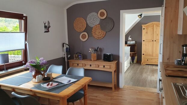Unsere liebevoll eingerichtete Ferienwohnung Adenberg liegt in der 1. Etage und bietet auf rund 60 m² genügend Platz für Erholung – mit und ohne Hund(e).