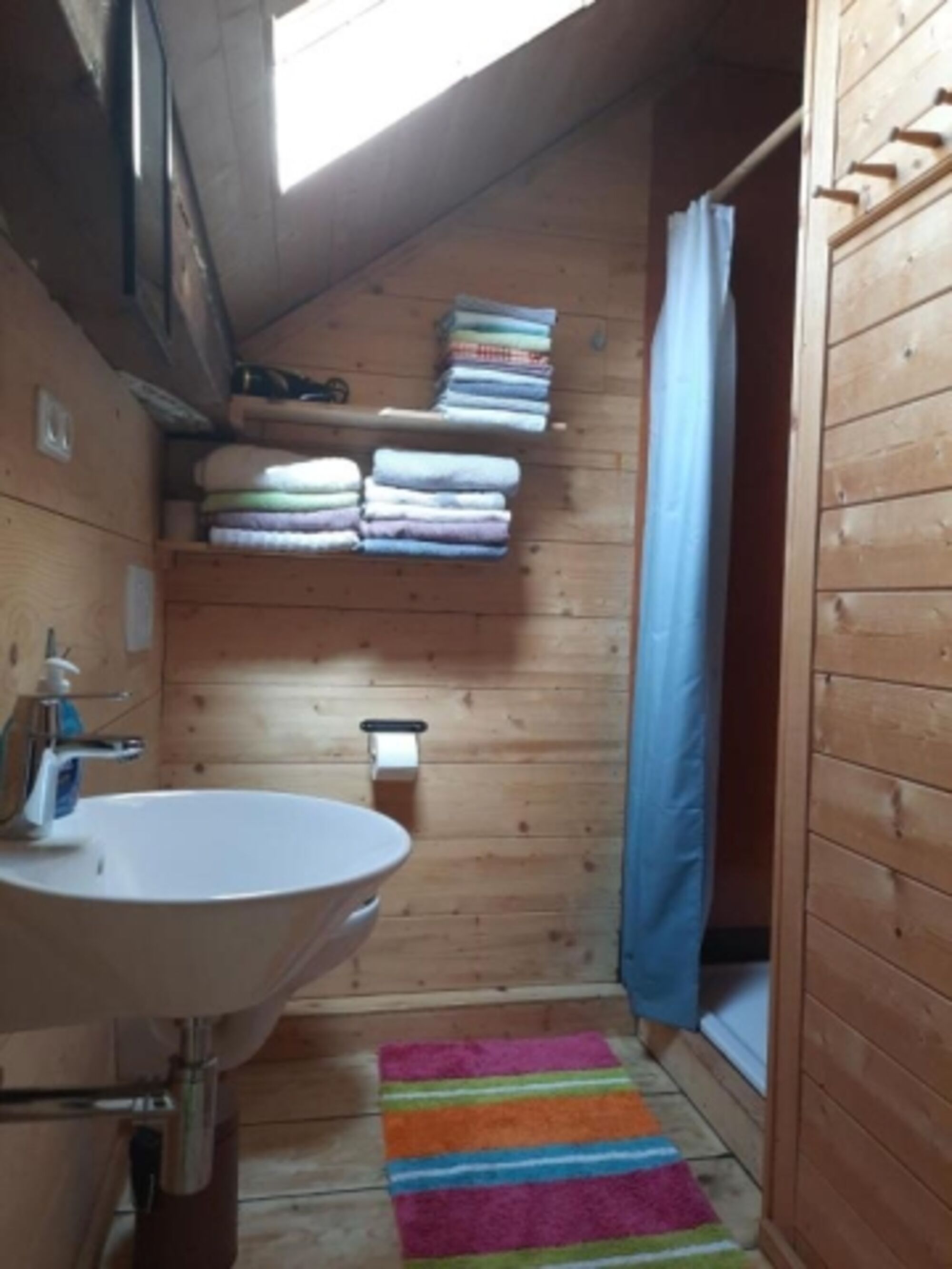 das Bad im Tennenlager Waschbecken, Spiegel, Fenster im Bad