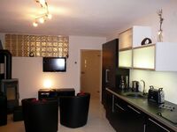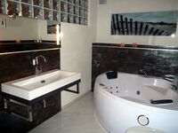 Das Bad verfügt über eine Badewanne mit Dusche und einem großen Waschtisch. Kinderausstattung auf Wunsch: Kinderwanne, Kinderreisebettchen mit Bettwäsche, transportable Kindertoilette und Spielzeug. Die Wohnung ist mit Fußbodenheizung ausgestattet.