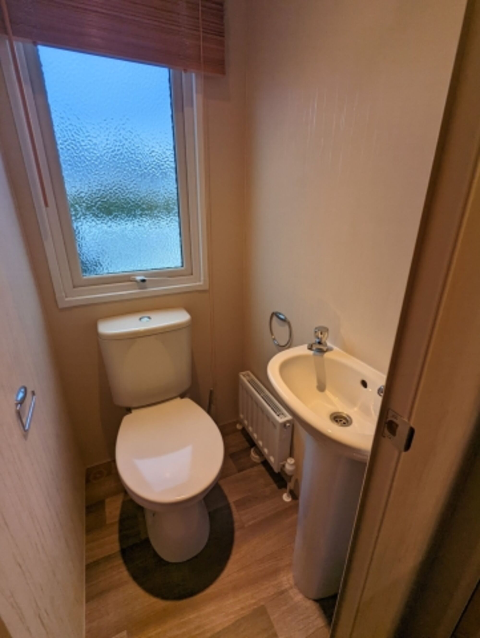 Kleines Bad mit Dusche, Waschbecken und WC und ein seperates WC.