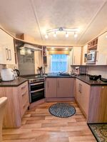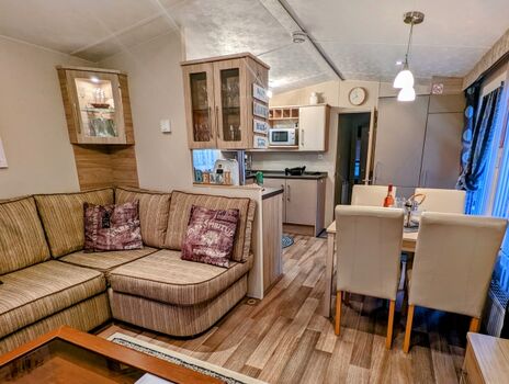 2 Sitzer-Sofa, Tisch mit 4 Stühle und große, voll ausgestattete Küche.