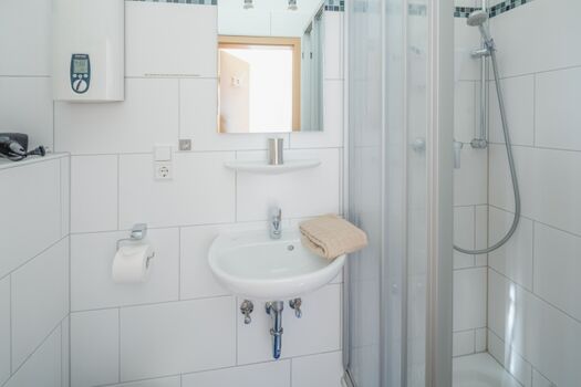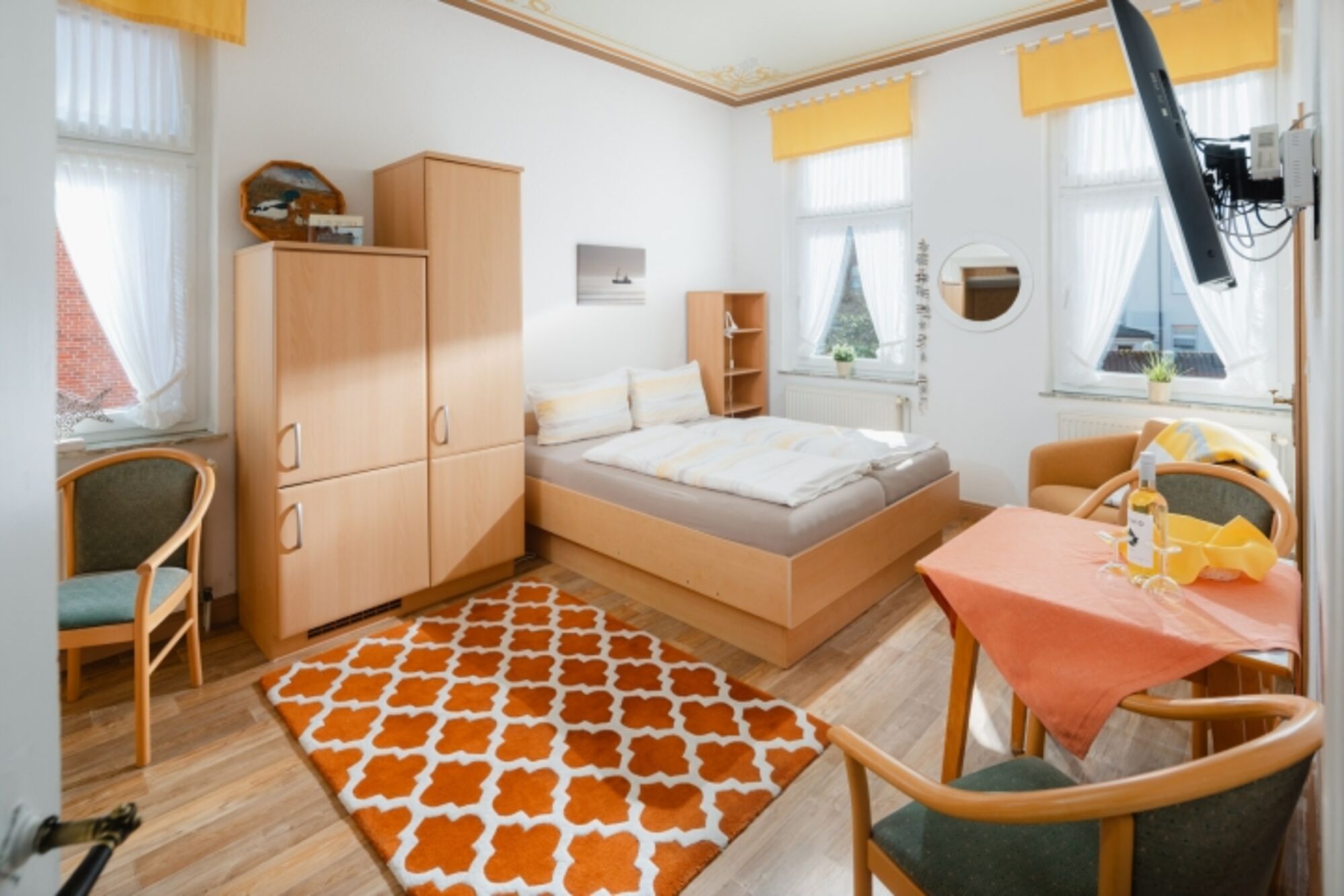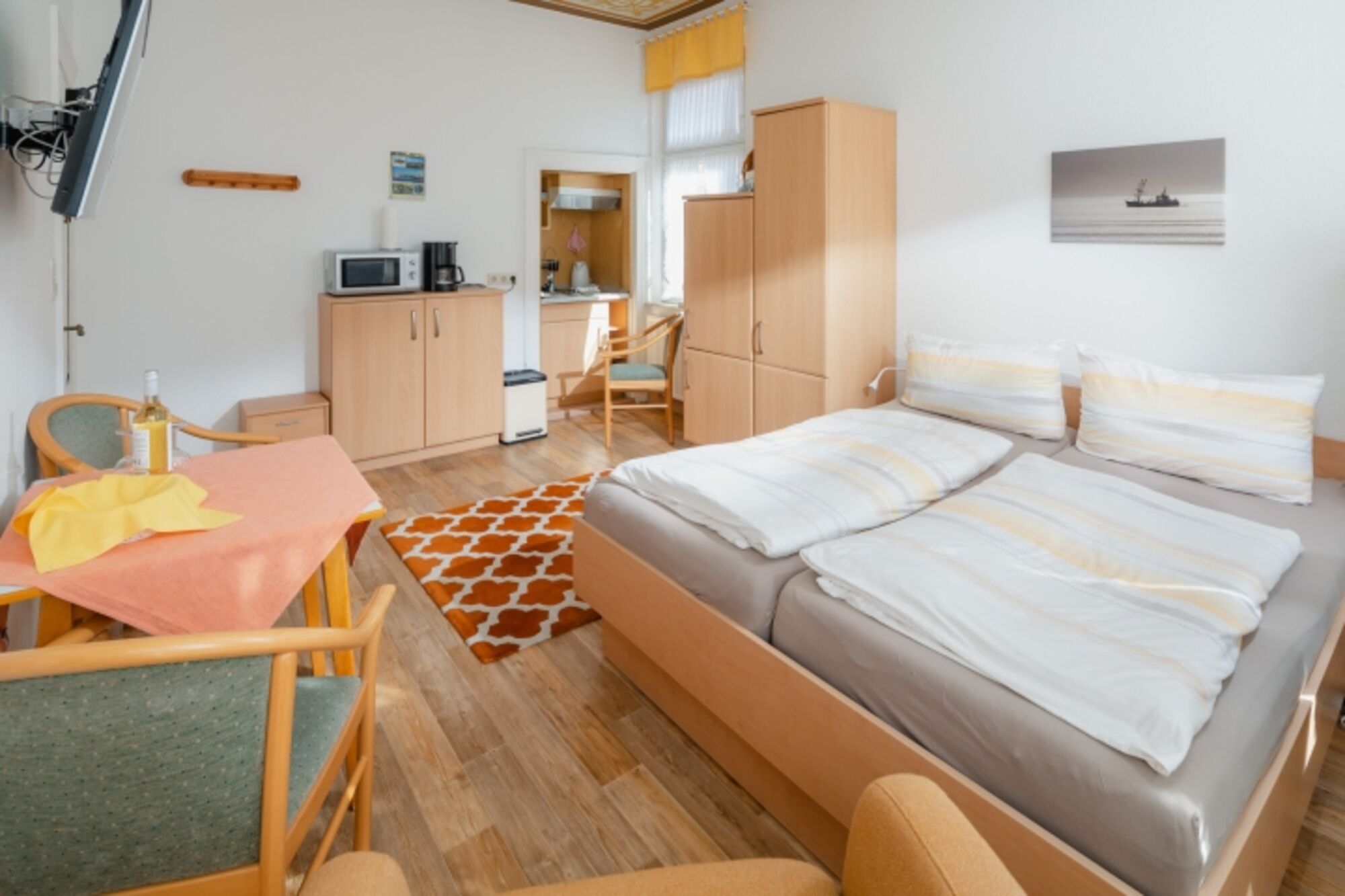 Ferienwohnung "Hilke" ist ein etwa 19 qm großes, helles Einraum-Apartment in der 1. Etage mit Blick in den Vorgarten. Die Ferienwohnung verfügt über eine kleine Kochzeile, einen Kühlschrank, einen Kleiderschrank, ein TV Gerät und ein kleines modernes Duschbad.