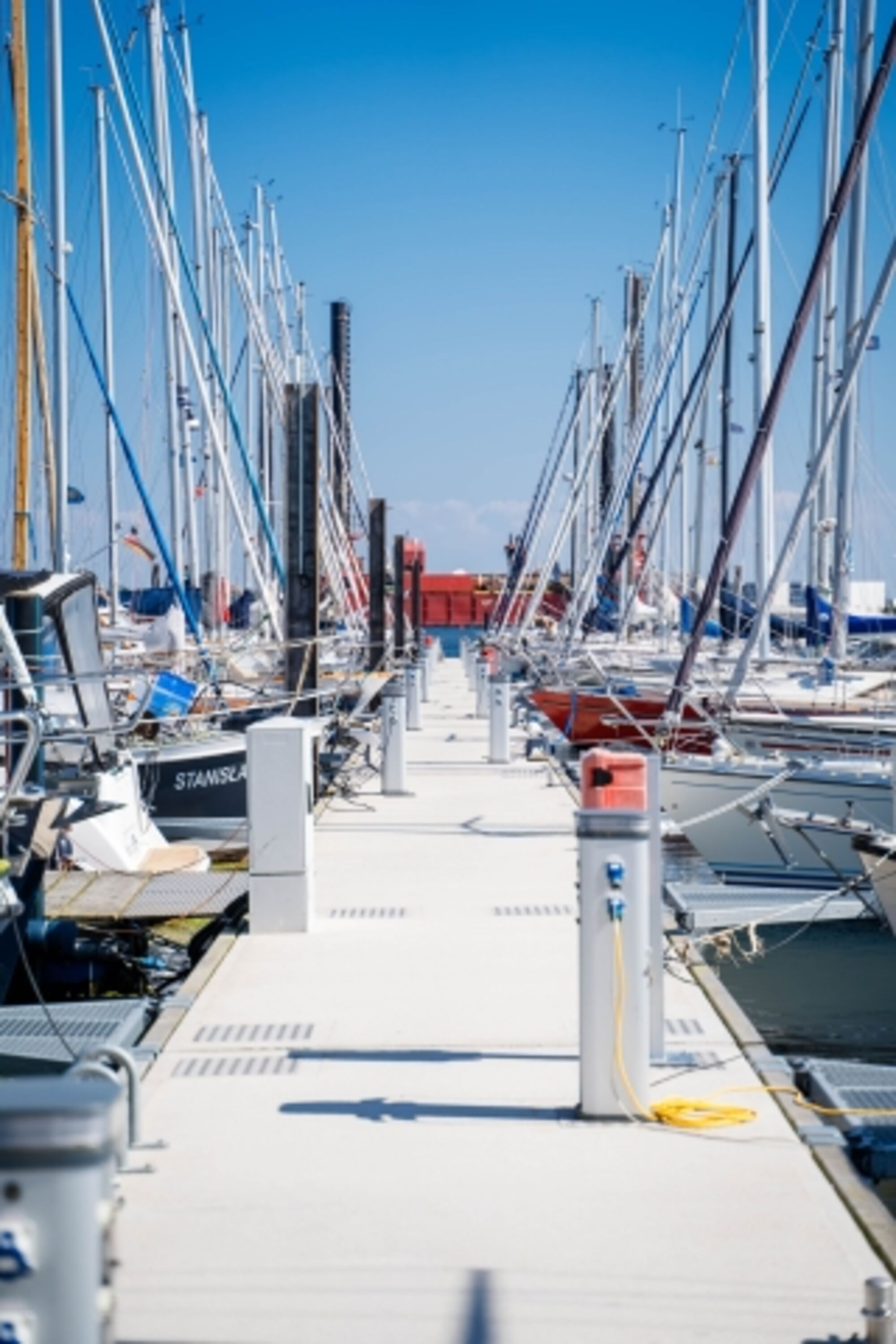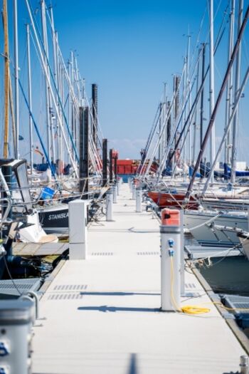 begrüßt Sie unser Hausboot ELLA im ruhigen Yachthafen Burgstaaken auf Fehmarn mit Blick auf die Fehmarnsundbrücke.