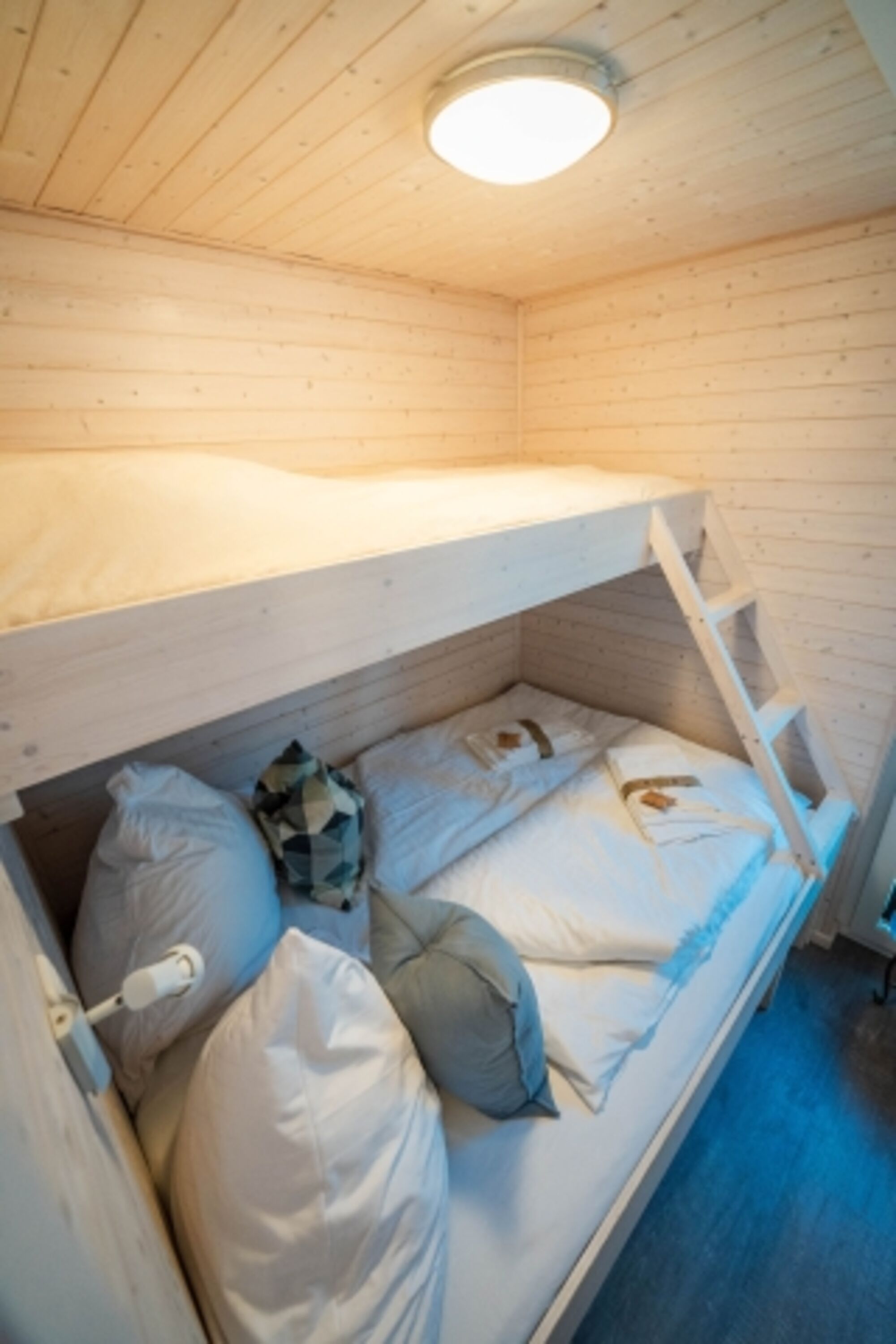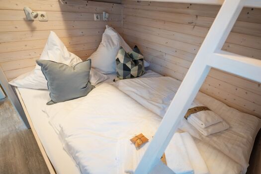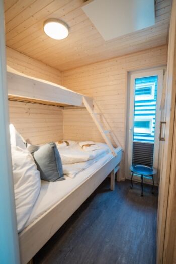 Die beiden Schlafzimmer mit bodentiefen Fenstern verfügen über bequeme Doppelbetten (160×200 und 140×200) sowie ein Hochbett (80×200) im vorderen Schlafraum. Alle Fenster sind mit Plissees (Sichtschutzrollos) ausgestattet,