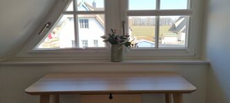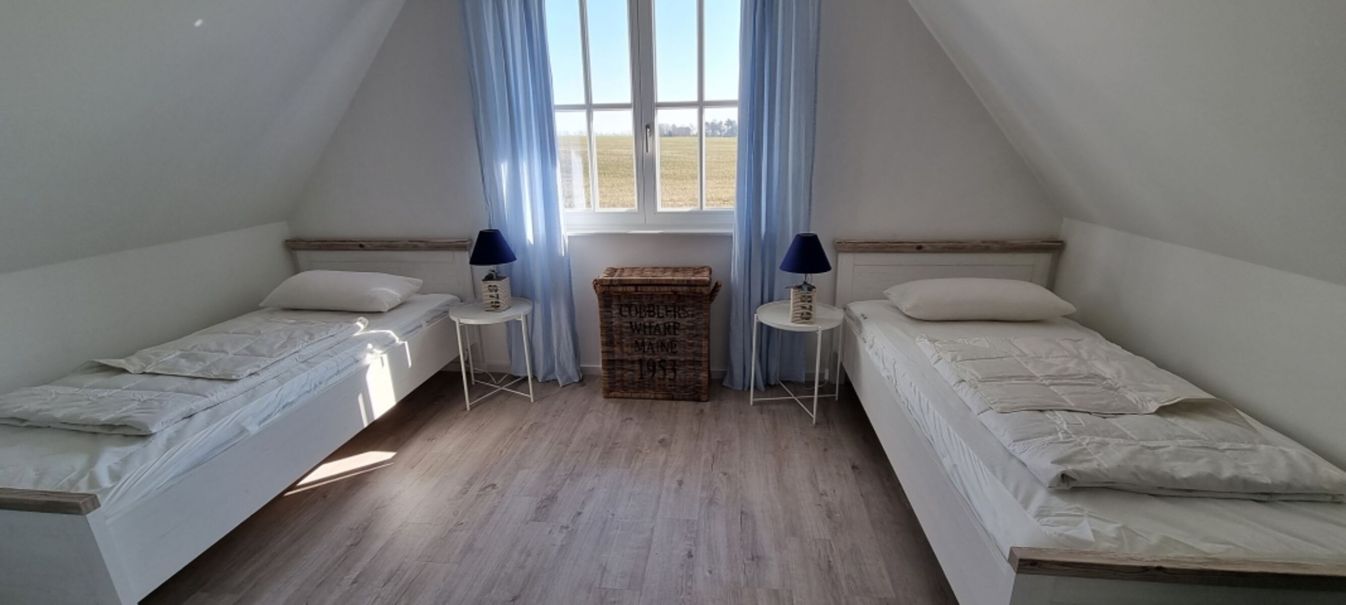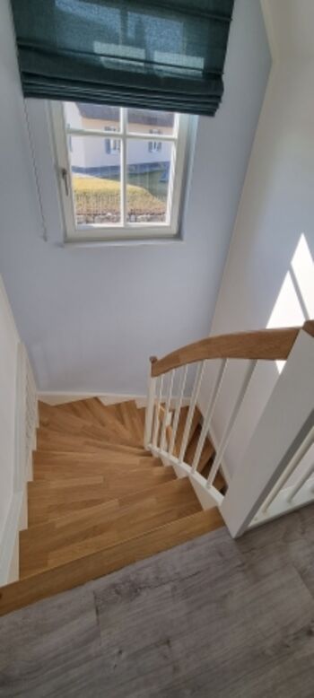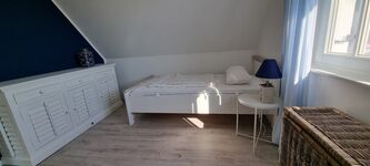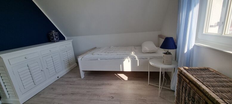 Im Obergeschoss befinden sich die zwei Schlafzimmer und das Duschbad. Das erste Schlafzimmer ist mit einem Doppelbett, Kommode und Schreibtisch ausgestattet. Im zweiten Schlafzimmer stehen zwei Einzelbetten und eine weitere Kommode. Die Bettwäsche ist gegen Gebühr buchbar.