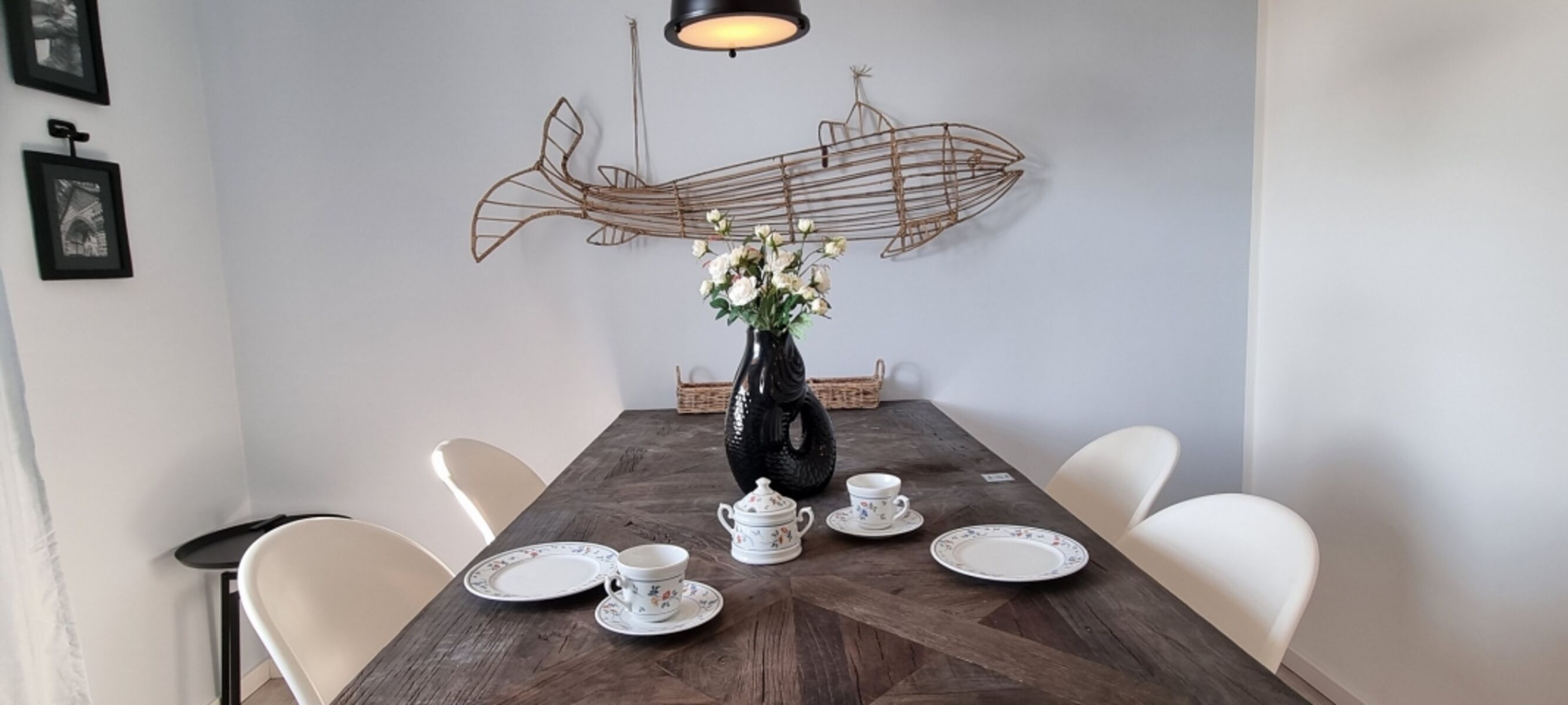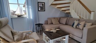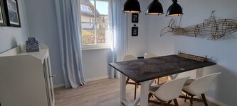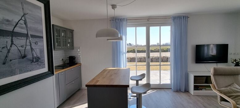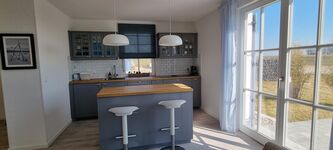 Es ist im nordischen Stil liebevoll eingerichtet. Das Erdgeschoss ist großzügig gestaltet. Im Wohnbereich ist die moderne Küchenzeile integriert. Sie ist hochwertig mit Geschirrspüler, Induktionsherd und vielen weiteren Extras ausgestattet. Ein schnelles Frühstück kann am Küchentresen eingenommen werden. Das separate Esszimmer ist ein kleines Highlight zu den anderen Reethäusern im Ferienhausgebiet. Hier können Sie ganz gemütlich Speisen oder Spielabende erleben. Des Weiteren ist im Erdgeschoss das Gäste-WC und der Hauswirtschaftsraum mit Waschmaschine und Putzutensilien.