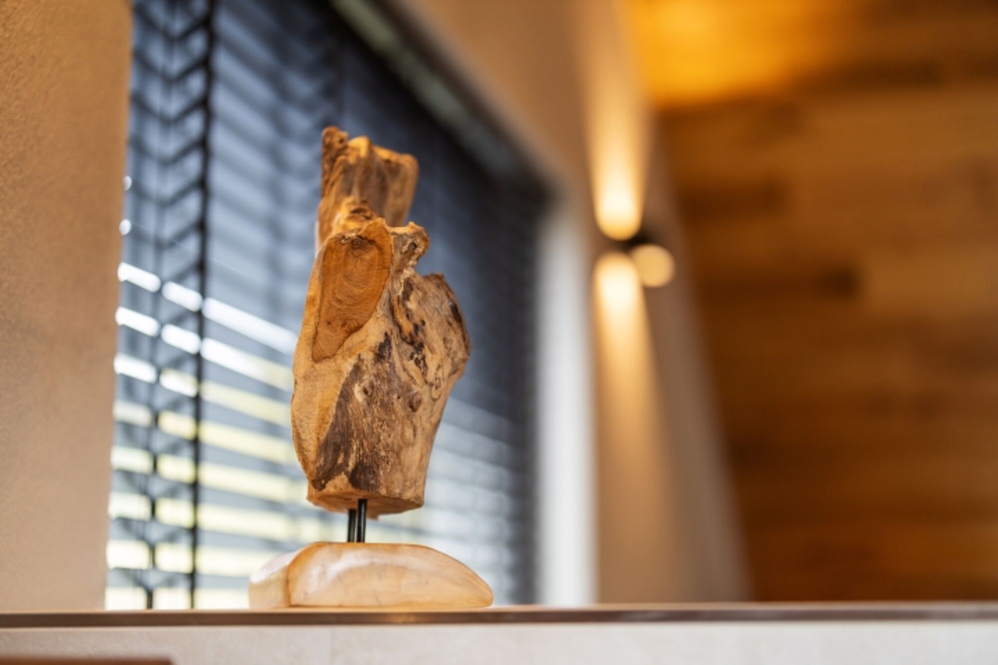 Das Schlafzimmer hat eine innenliegende Verglasung zur Empore/Wohnbereich hin, natürlich mit Gardinen für die Nacht.