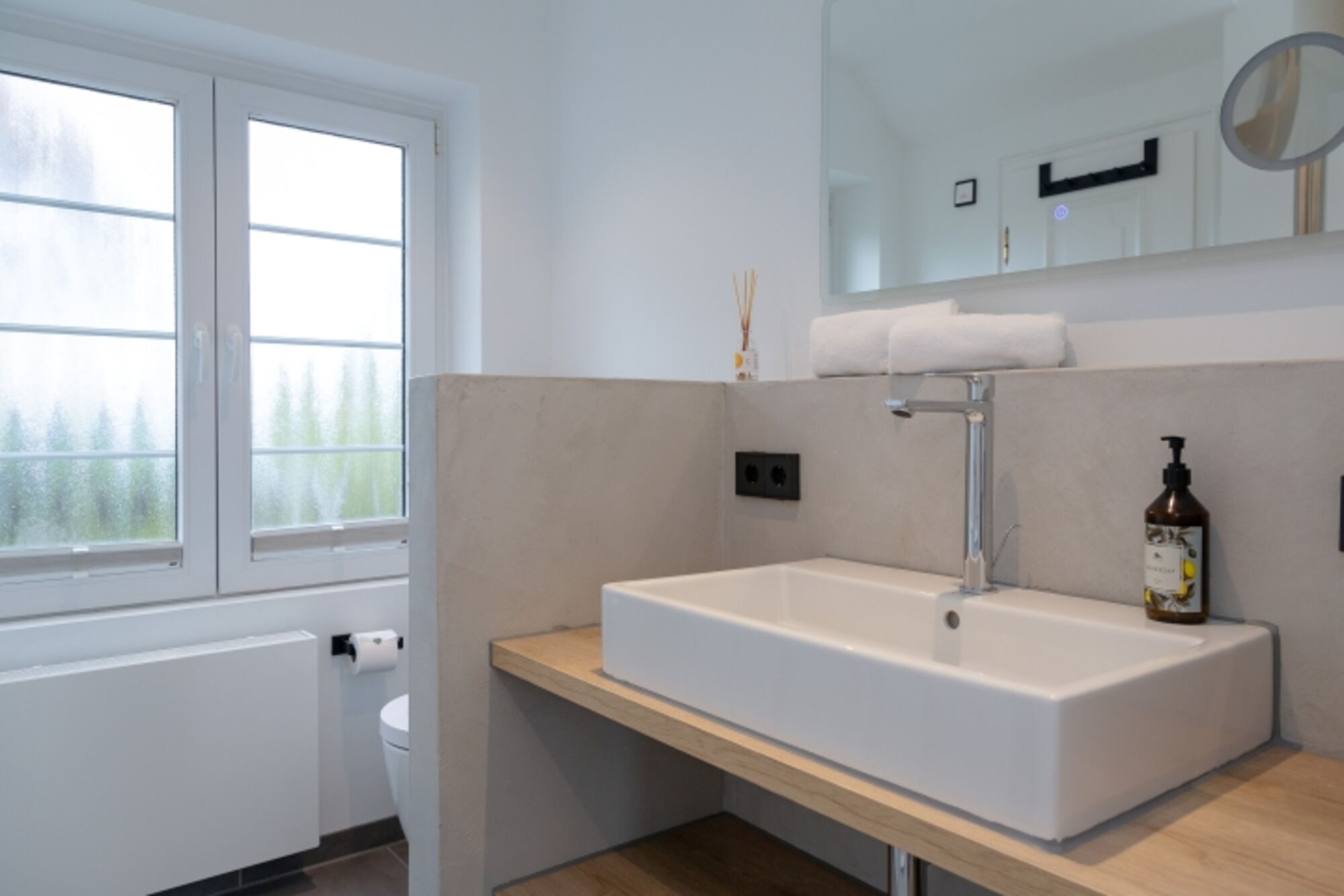 Waschbecken, Spiegel, Fenster im Bad
