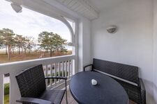 Der große, möblierte Balkon bietet Ihnen einen eindrucksvollen Blick auf Düne, Bäume und Meer (siehe Foto).