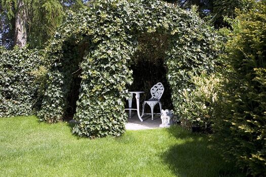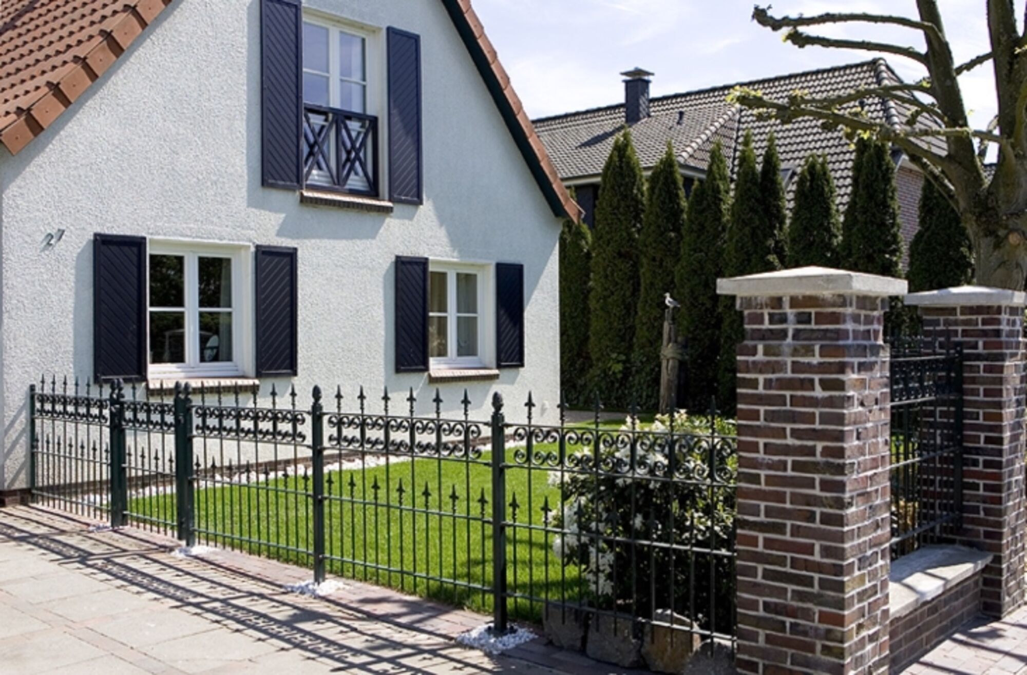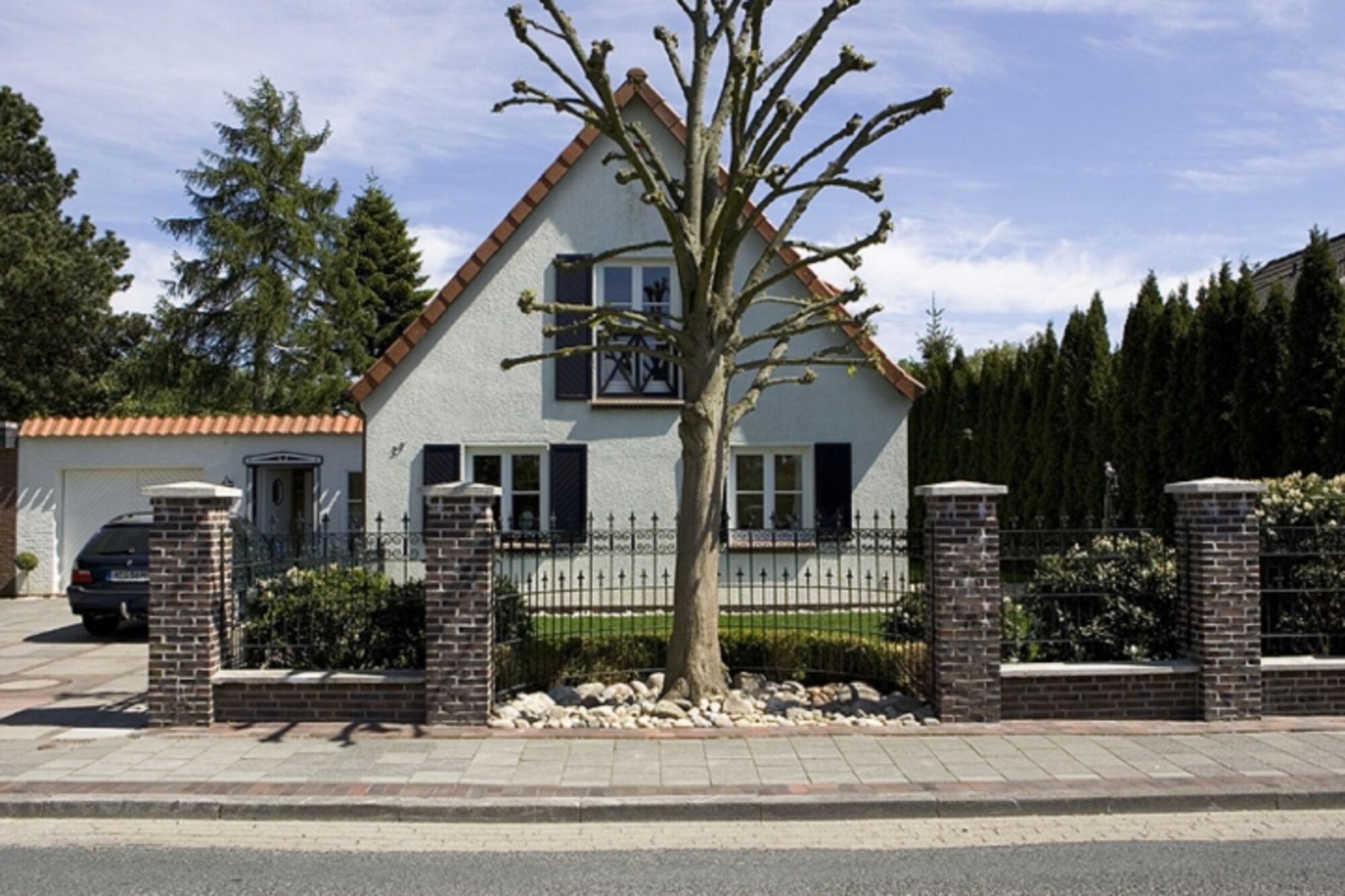 eingezäunter Garten, Strandkorb, Gartenmöbel, Holzgrill