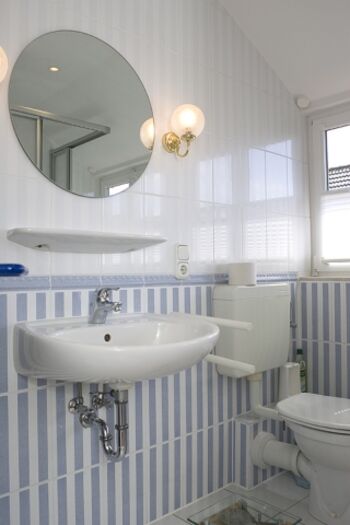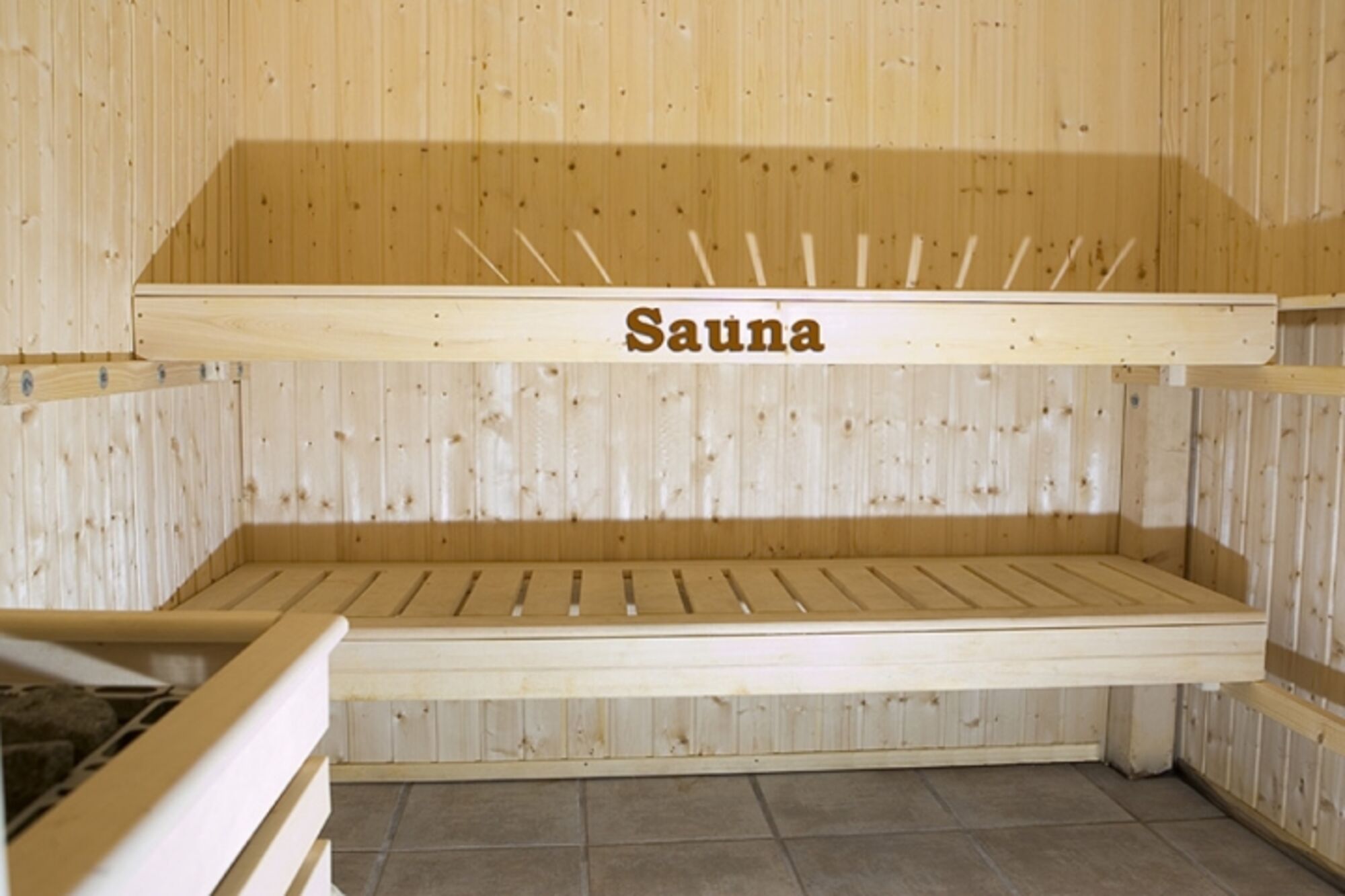Die Sauna befindet sich im Keller. Waschbecken, Spiegel, Fenster im Bad