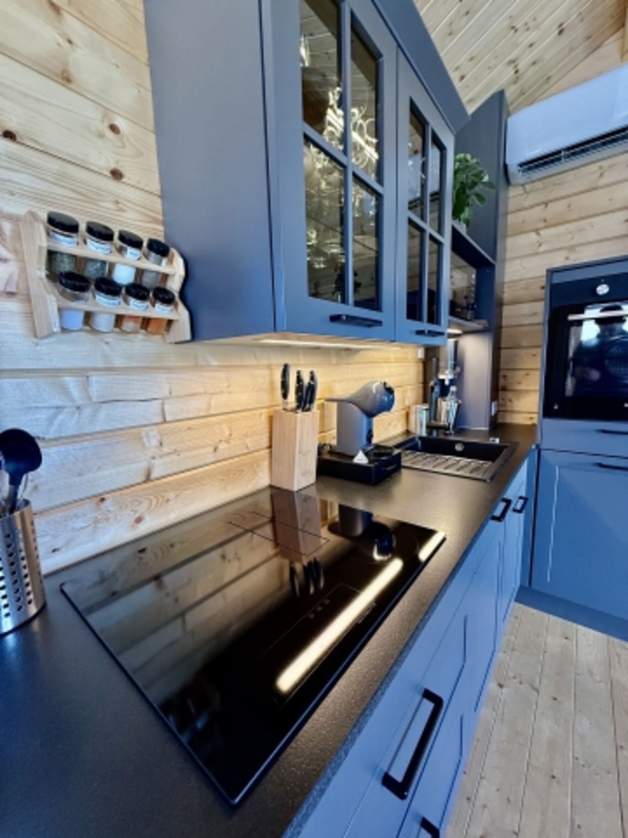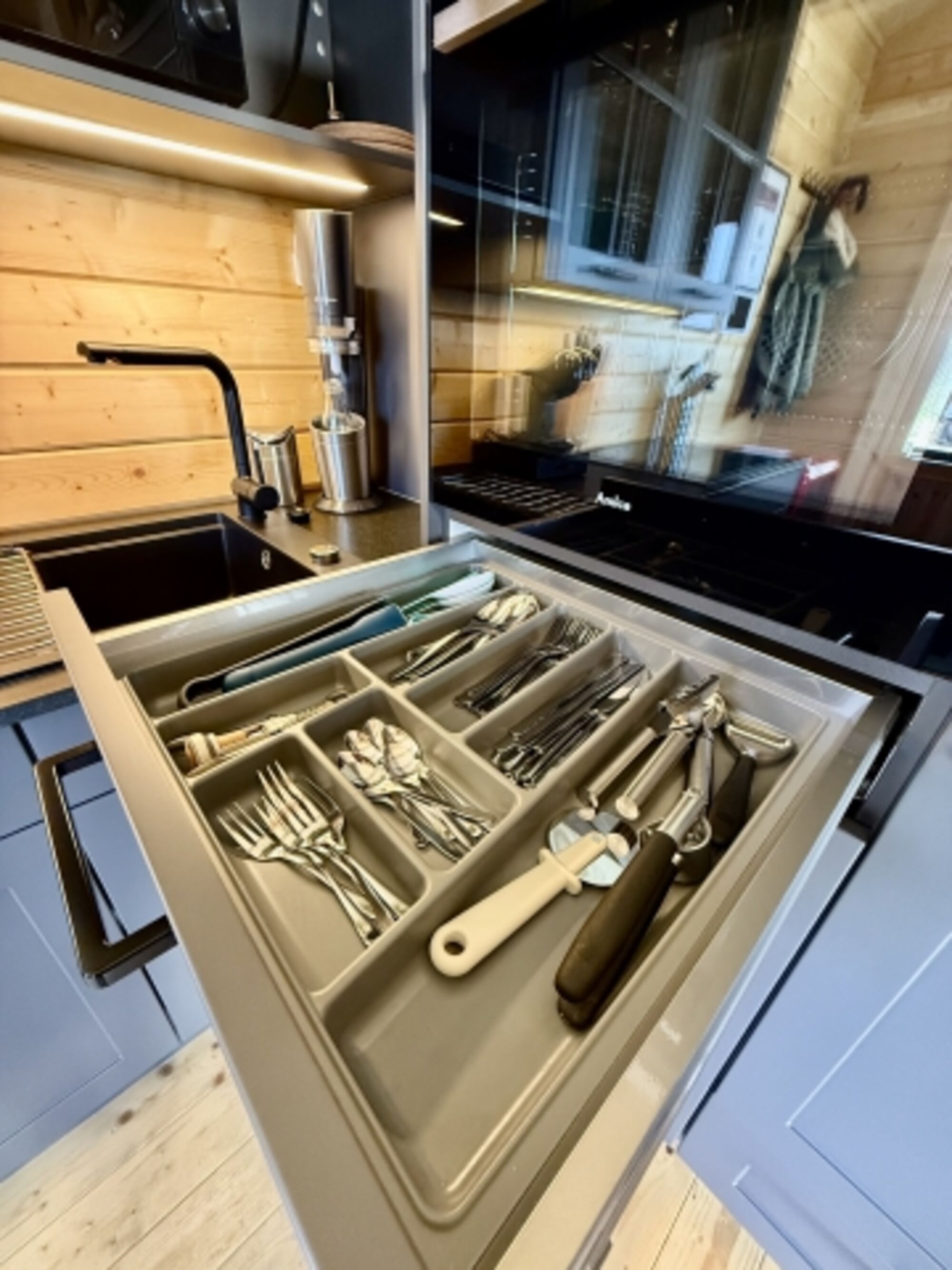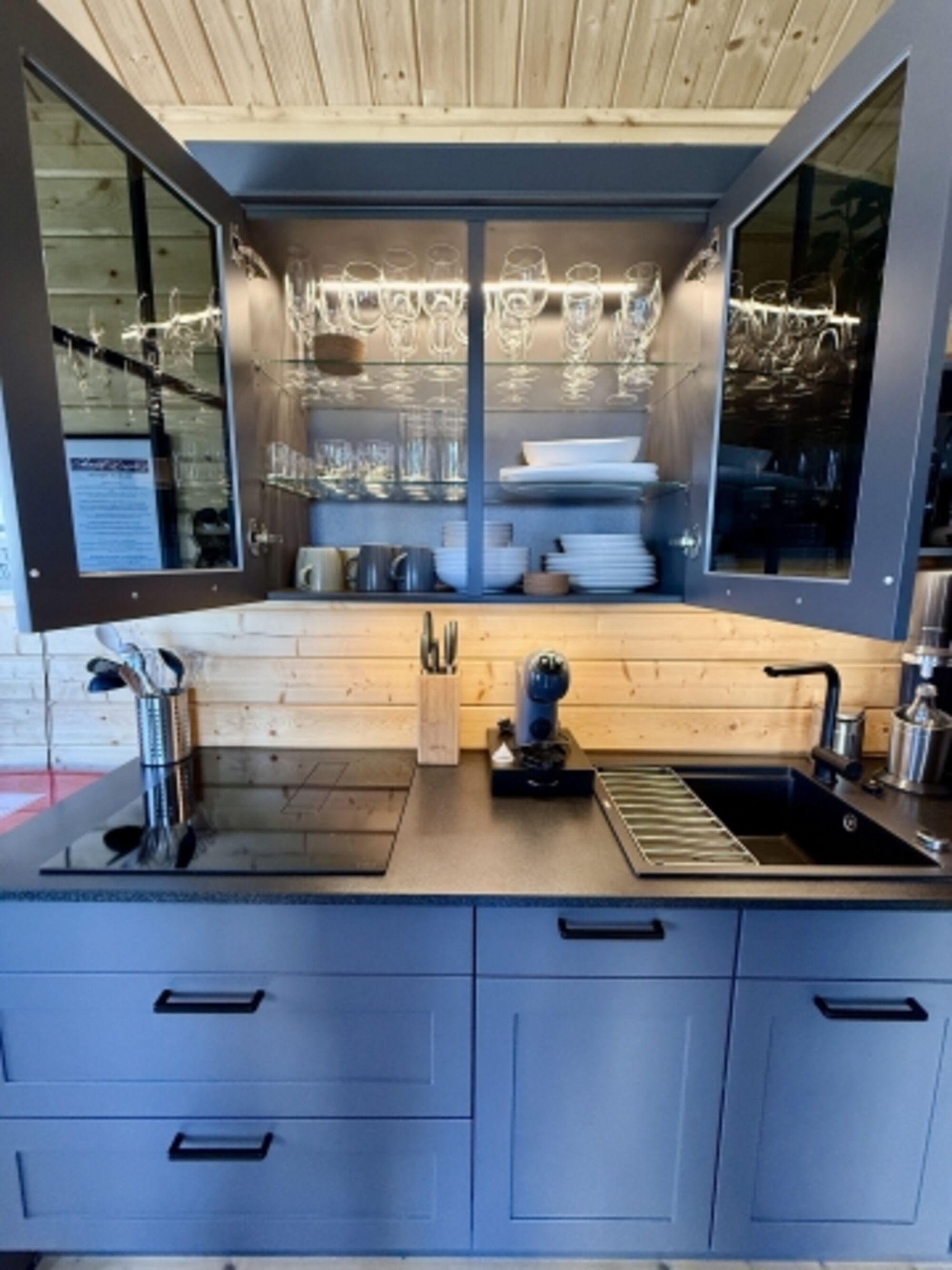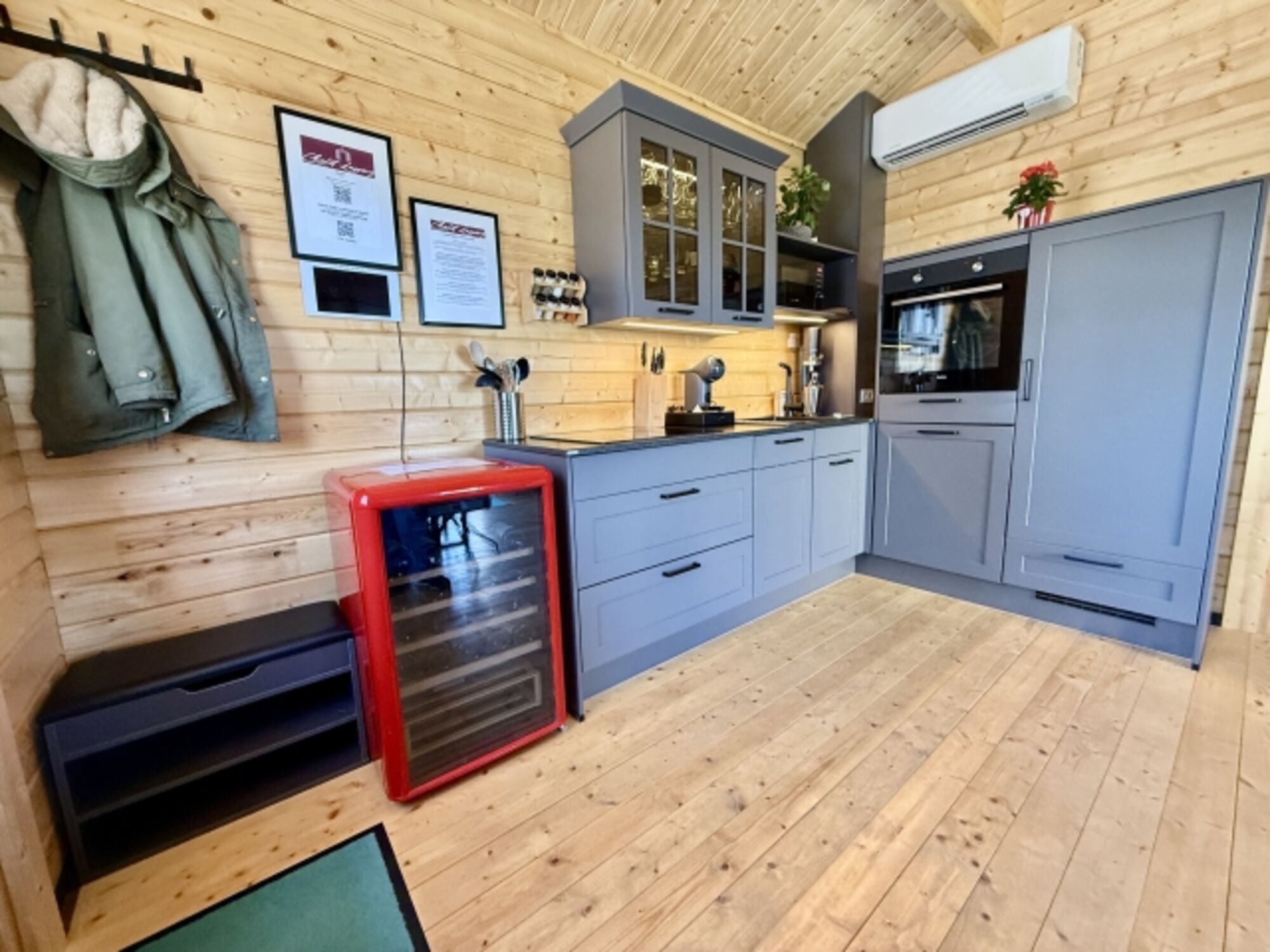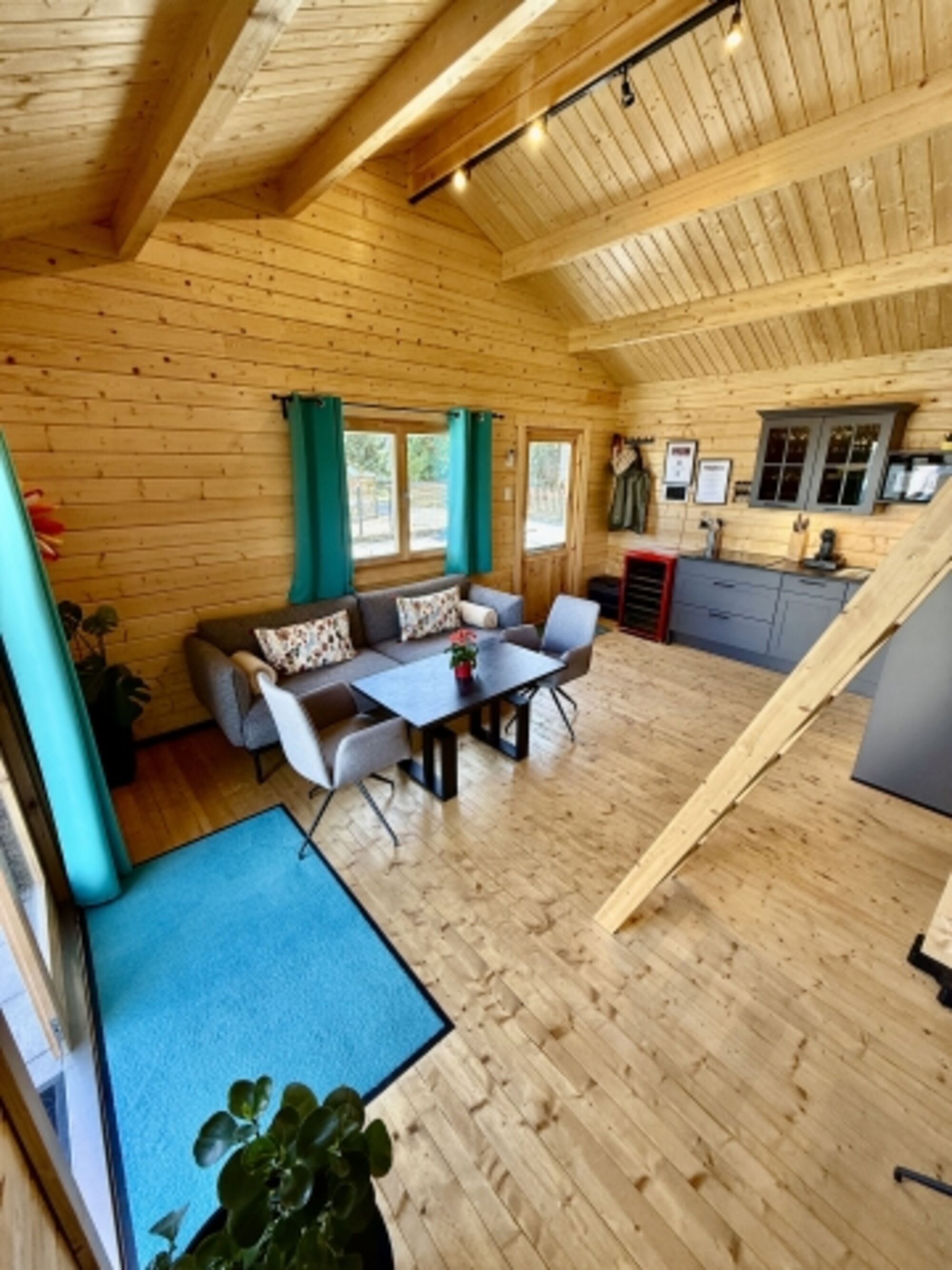 Außerdem verfügt unser Chalet über einen offenen Wohnraum (klimatisiert) mit einer Küche, einem Sofa (für 3 Personen) sowie einen ausziehbaren und höhenverstellbaren Ess-/Wohnzimmertisch mit 3 zusätzlichen drehbaren Stühlen (so können 6 Personen am Esstisch sitzen). Der Weinkühlschrank verfügt über eine exklusive Auswahl von Weinen aus der Region.