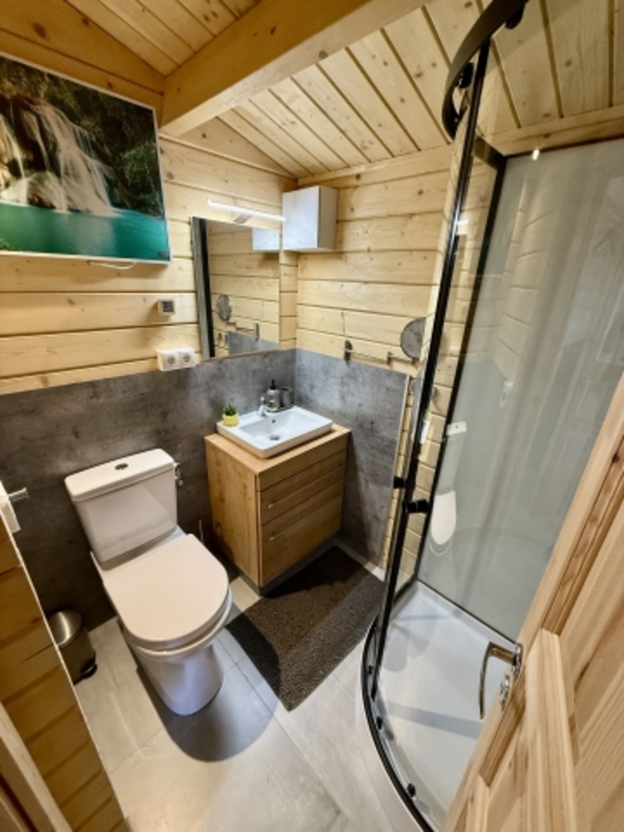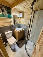 Das Badezimmer verfügt über eine moderne Dusche, einen kleinen Waschtisch sowie eine Toilette.
