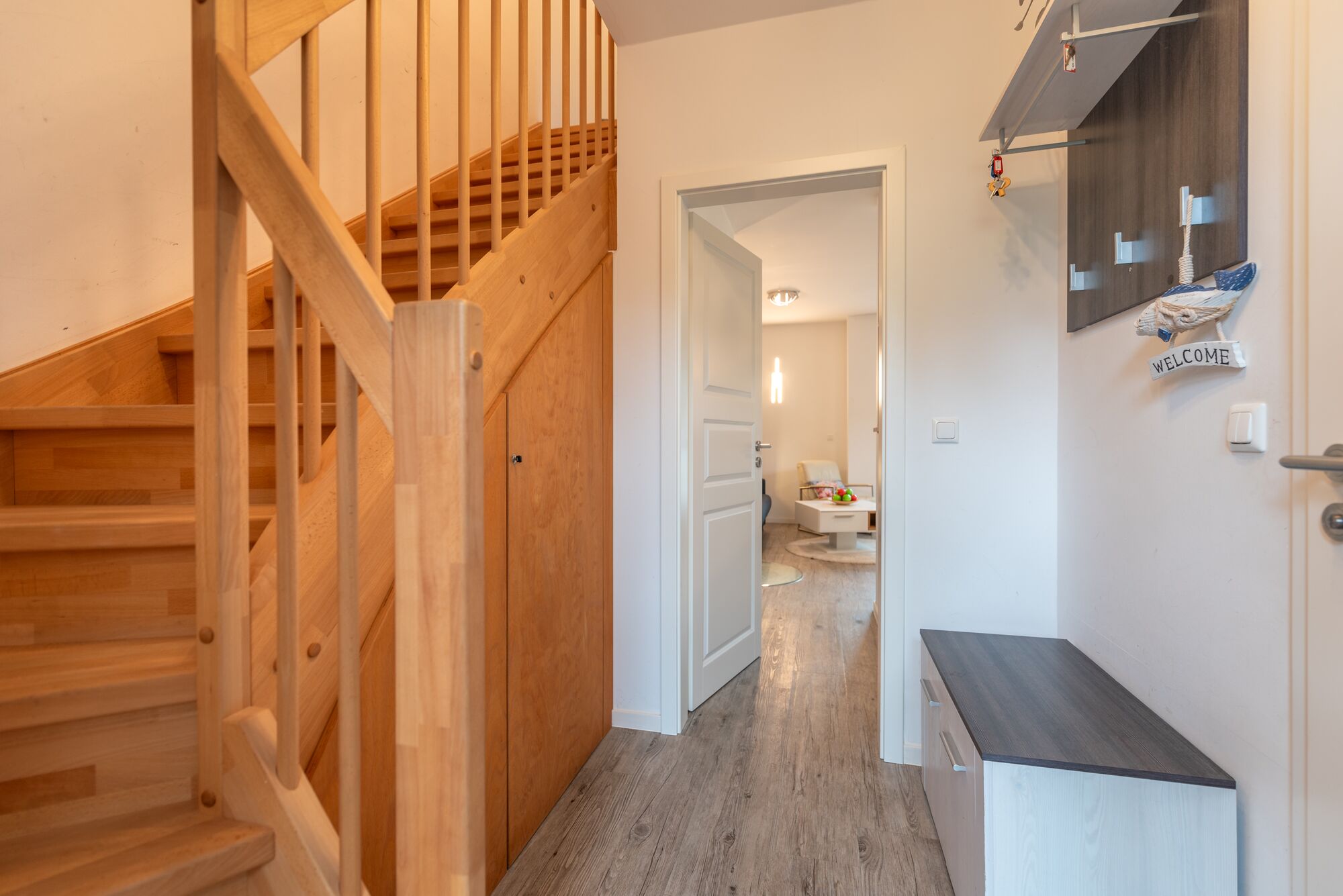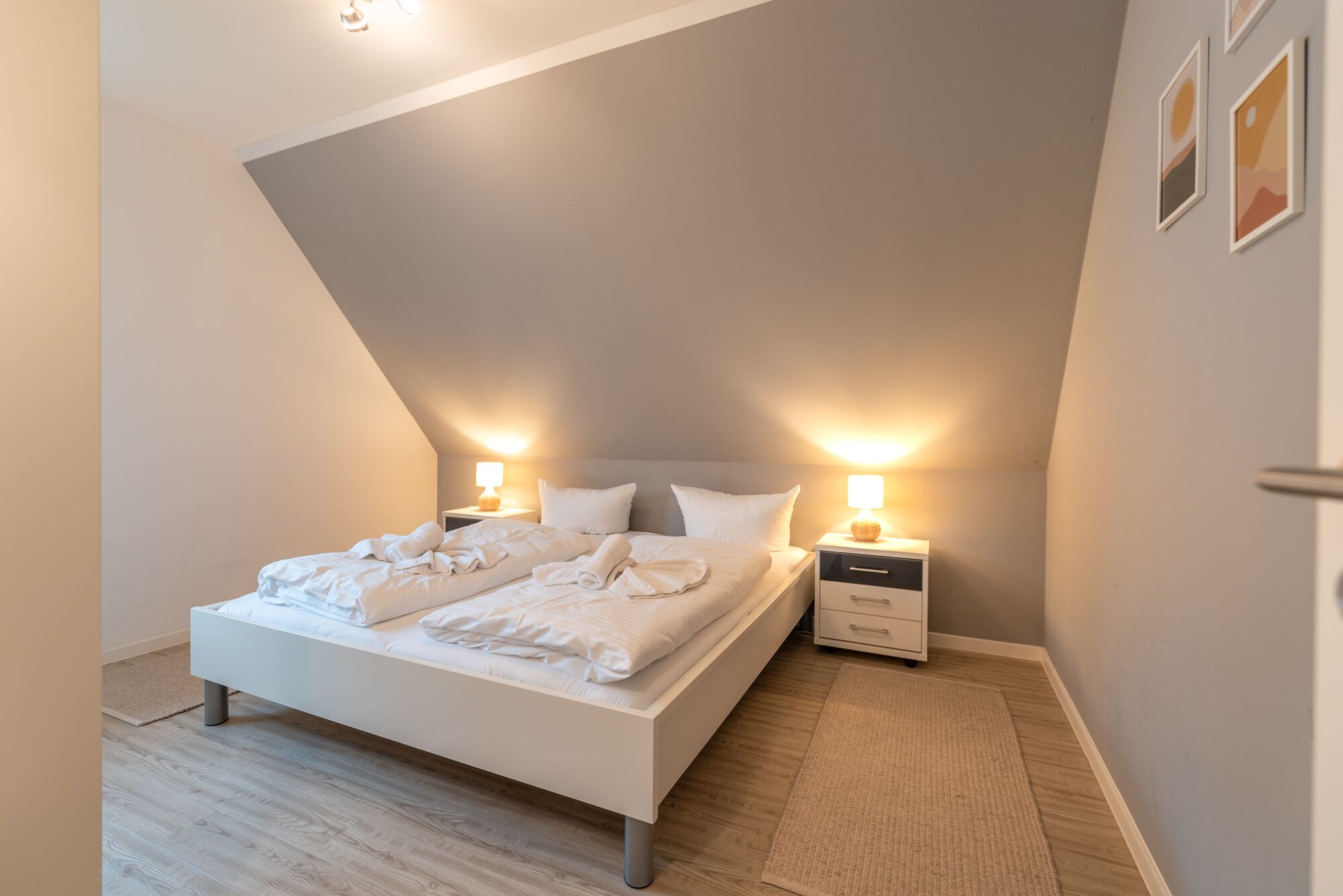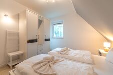 Das Obergeschoss beherbergt zwei liebevoll eingerichtete Schlafzimmer: eines mit einem komfortablen Doppelbett, das andere mit zwei Einzelbetten – ideal für Kinder oder Mitreisende. Ergänzt wird die Etage durch ein weiteres Badezimmer mit Dusche, WC und Waschmaschine.
