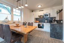 Im Erdgeschoss erwartet Sie ein einladender Wohnbereich mit gemütlicher Schlafcouch, Sessel, Smart-TV und einem wärmenden Kamin für behagliche Abende. Der angrenzende Essbereich mit offener Küche bildet das Herzstück des Hauses und lädt zu gemeinsamen Mahlzeiten ein. Ein besonderes Highlight ist das Badezimmer mit Dusche, WC und Sauna, das pure Entspannung verspricht.