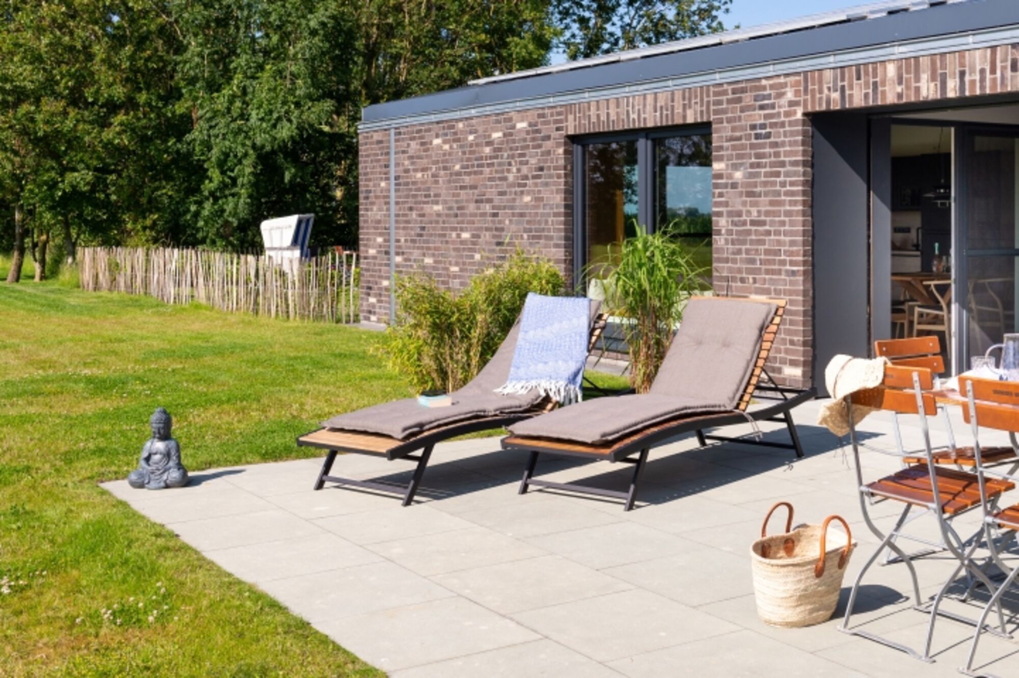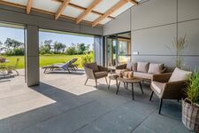 Die wunderschöne neue Wohnung hat zusätzlich einen großen überdachten Außenbereich mit Zugang zur Sauna. Hier kann man wunderbar windgeschützt sitzen - auch wenn der nordfriesische Wind weht - und die Aussicht in die Natur genießen.