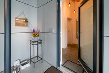 Die Sauna ist nicht im Bad, sondern separat mit direktem Zugang zum überdachten und geschützten Außenbereich der Wohnung.