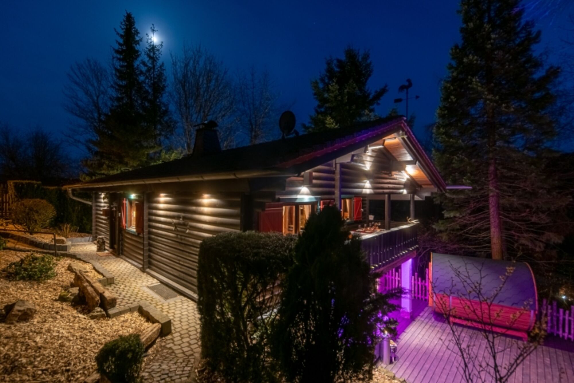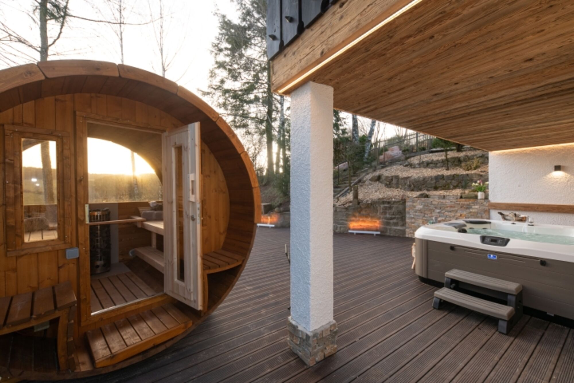 Alle, die sich einen erholsamen Luxusurlaub wünschen, der sämtliche Standards übertrifft, werden beim Anblick unseres alpinen Holzhauses ins Schwärmen geraten. Im tiefsten Grün der idyllischen Eifel, hinter schützenden Baumkronen gelegen, entfaltet die gemütliche Almhütte ihre volle Pracht erst nach Betreten des 150 Quadratmeter großen Anwesens. Während der große Außenbereich ins Freie lockt und erholsame Genussmomente unter freiem Himmel verspricht, bietet auch die Inneneinrichtung der luxuriösen Ferienwohnung alles, was das Herz begehrt. Außensauna, Whirlpool sowie eine Regenwalddusche auf der von Tannen umwobenen Terrasse garantieren ausgiebige Wohlfühl-Momente mit einem besonderen Highlight: Sie nutzen den Spa-Bereich vollkommen privat, exklusiv und sichtgeschützt. Die moderne Komfortausstattung in den beiden Schlafzimmern, der Designerküche sowie dem Bad- und Wohnbereich rundet Ihr Urlaubsglück mit dem perfekten Quäntchen Luxus aufs Angenehmste ab.