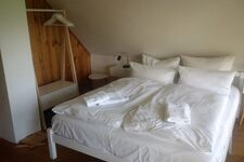 Schlafräume im OG: 1 Schlafraum mit 1 Doppelbett und Boddenblick, 1 Schlafraum 1 Doppelbett und 1 Einzelbett; Fußböden: Holz Doppelbett 1,60 x 2,00m, Leselampe am Bett