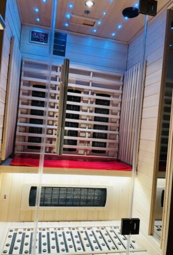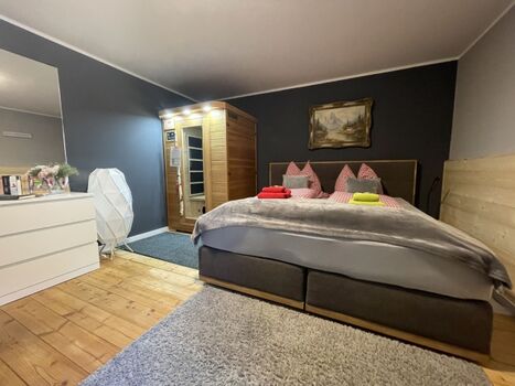 Im SZ befindet sich eine persönliche Infrarotkabine Boxspringbett, Kommode, Spiegel, Leselampe am Bett, Fliegengitter