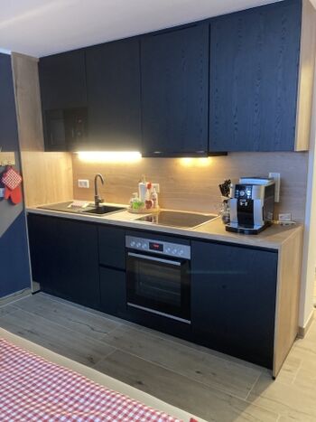 Cerankochfeld, Dunstabzugshaube, Kühlschrank mit Gefrierfach, Gefrierschrank, Kaffeevollautomat, Eierkocher, Mixer, Waffeleisen, Korkenzieher / Flaschenöffner, Gewürze (Salz, Pfeffer, Zucker), Öl / Essig, Geschirrhandtücher, Mülltüten, Essplatz in der Küche, TV in der Küche