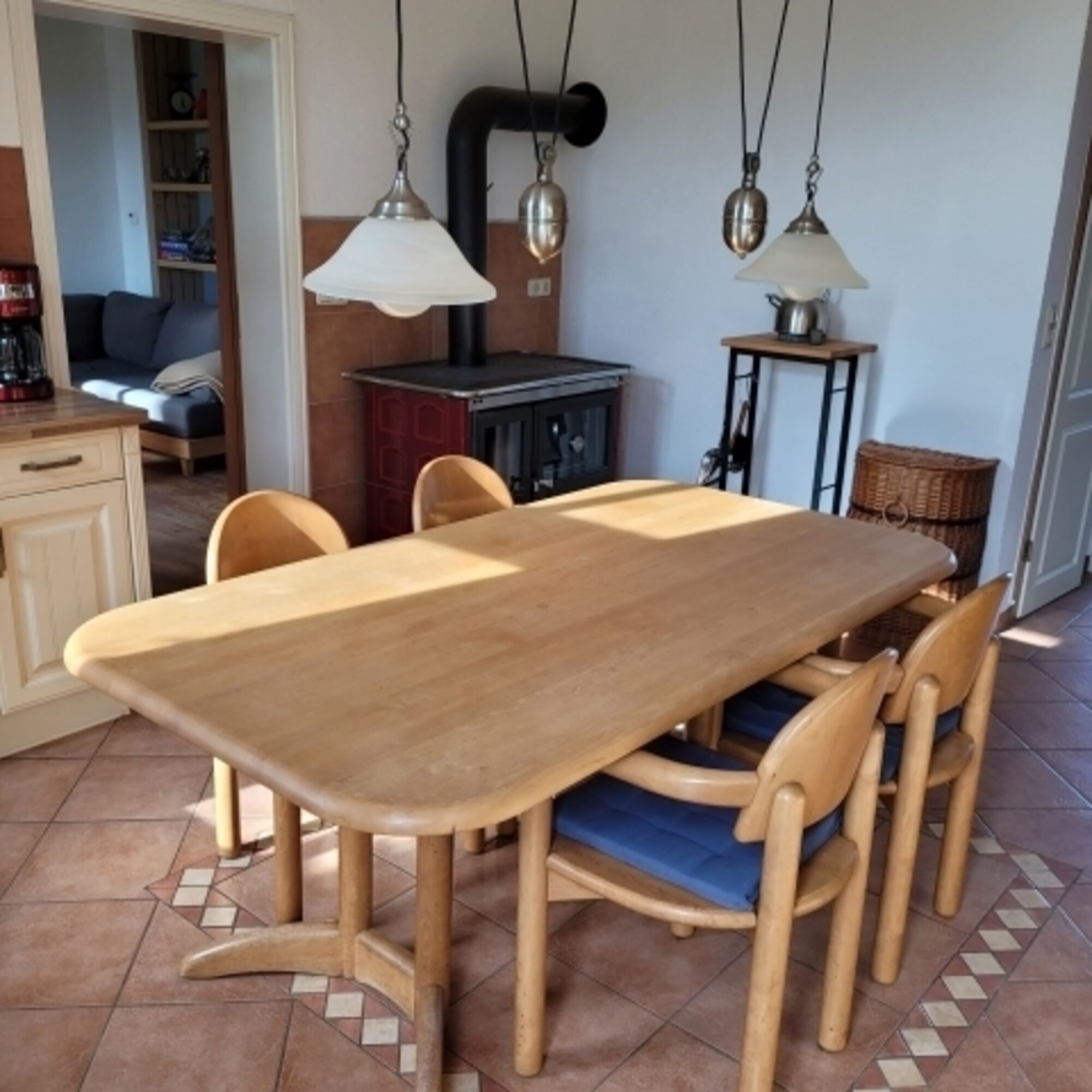 Cerankochfeld, Dunstabzugshaube, Kühlschrank mit Gefrierfach, Gefrierschrank, Mixer, Korkenzieher / Flaschenöffner, Geschirrhandtücher, Mülltüten, Essplatz in der Küche