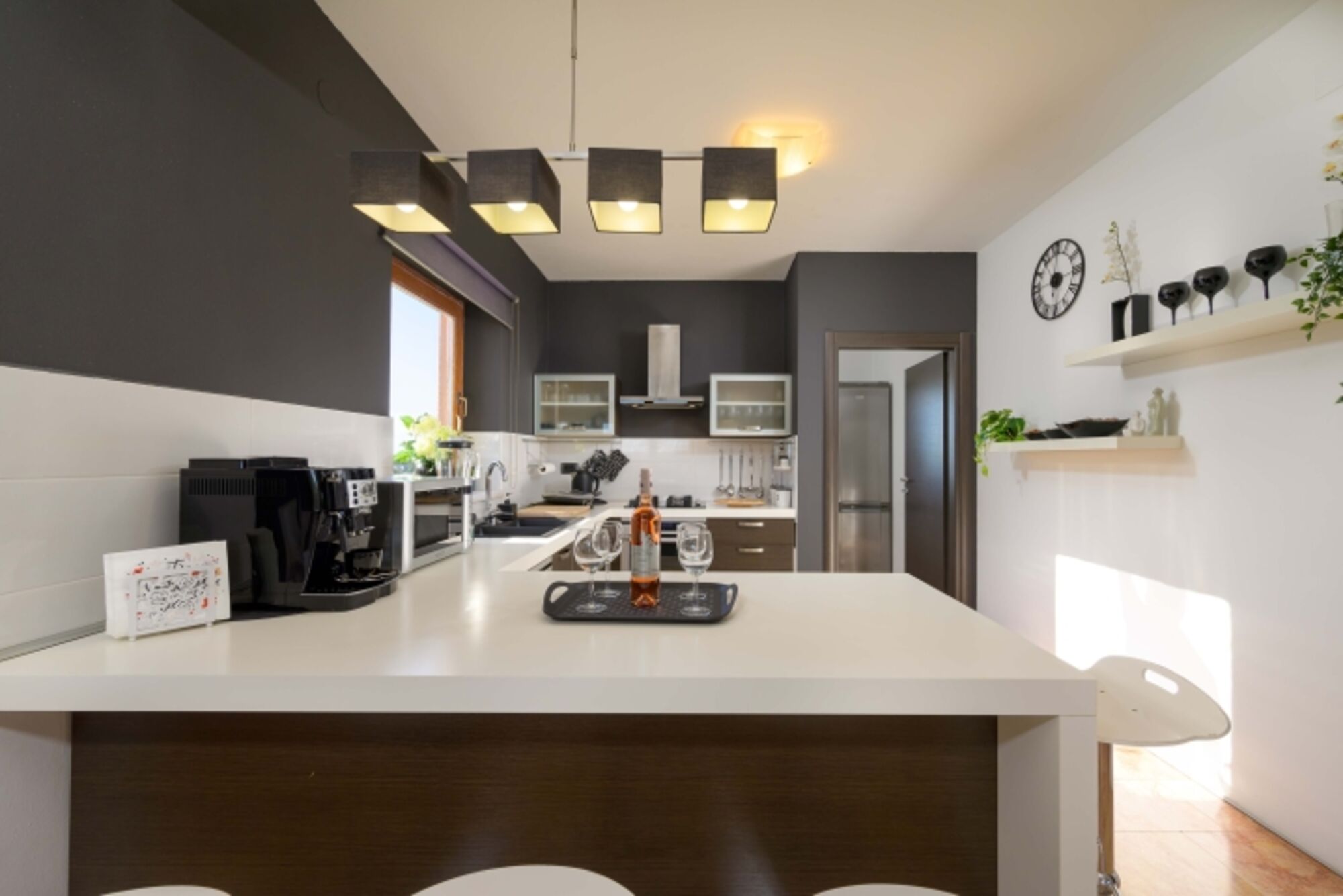 4-Platten Herd, Induktionsherd, Kühlschrank mit Gefrierfach, Gefrierschrank, Nespresso-Automat, Mixer, Geschirrhandtücher, Essplatz in der Küche