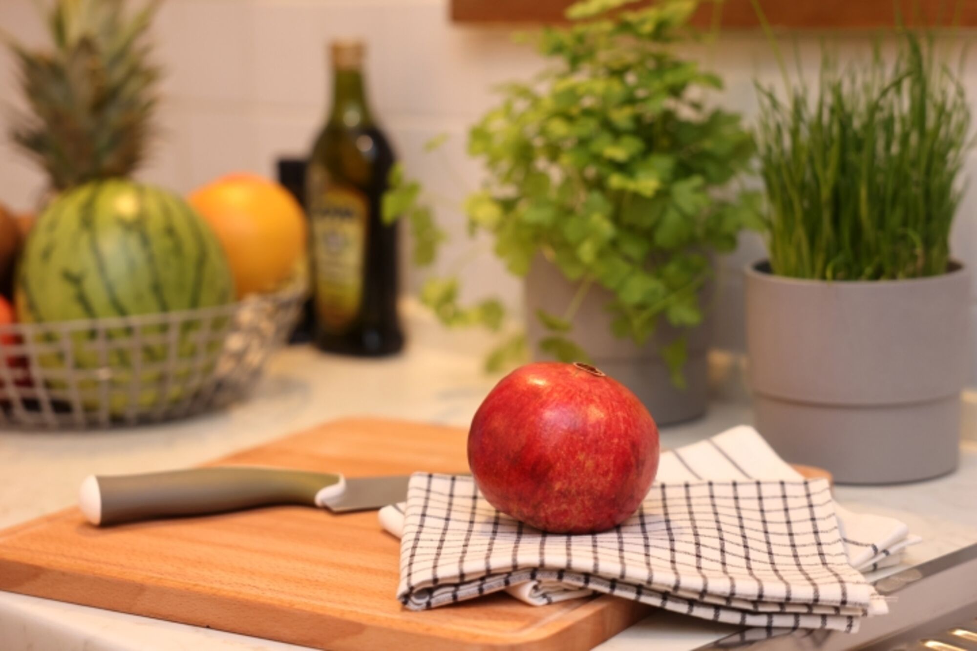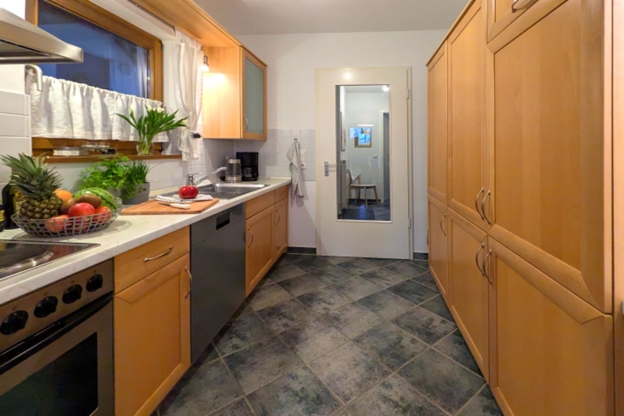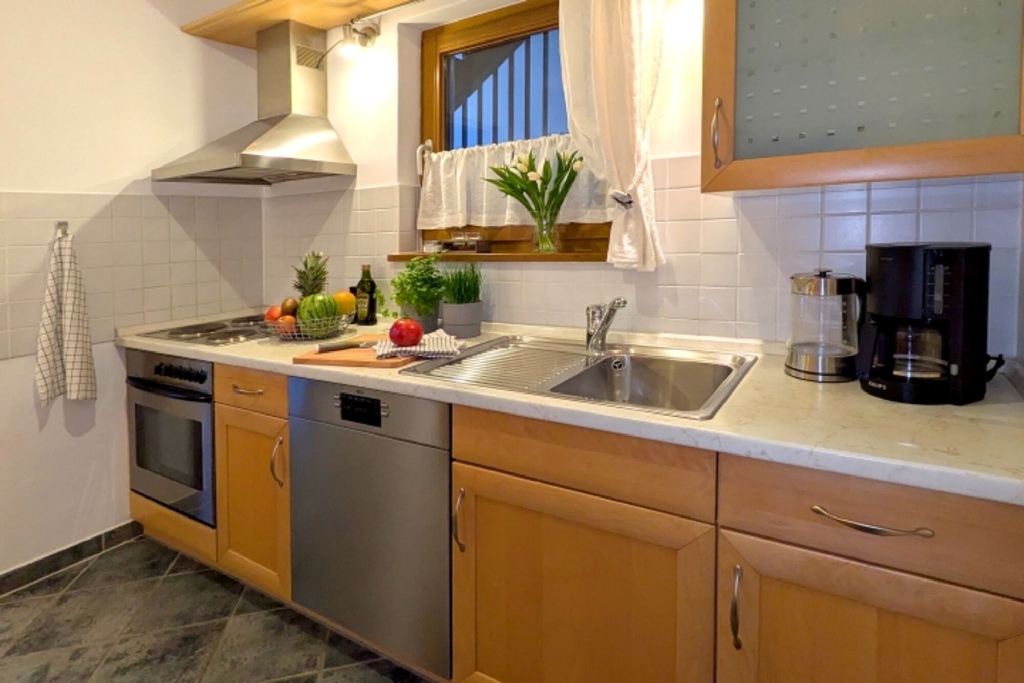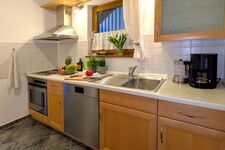 4-Platten Herd, Dunstabzugshaube, Kühlschrank mit Gefrierfach, Eierkocher, Korkenzieher / Flaschenöffner, Gewürze (Salz, Pfeffer, Zucker), Geschirrhandtücher, Mülltüten