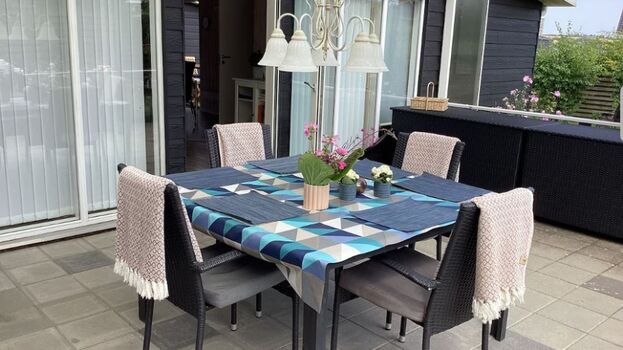Ganz nah zum Sandstrand & doppekt eingezäunt: Terrasse und Grundstück