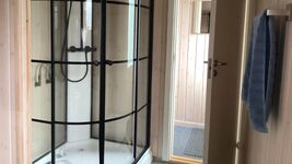 Das stilvoll gestaltete Badezimmer überzeugt mit einer großzügigen Duschkabine und einem WC, wodurch es die durchdachte Ausstattung des liebevoll eingerichteten Ferienhauses perfekt ergänzt.