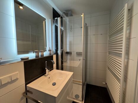 Die Ferienwohnung "Sonne" bietet ein Wohn- / Esszimmer mit offener Küche und Austritt auf den Balkon, ein Schlafzimmer (Doppelbett 180 X 200), ein weiteres Schlafzimmer mit 2 Einzelbetten (je 90 X 200) sowie ein Duschbad.