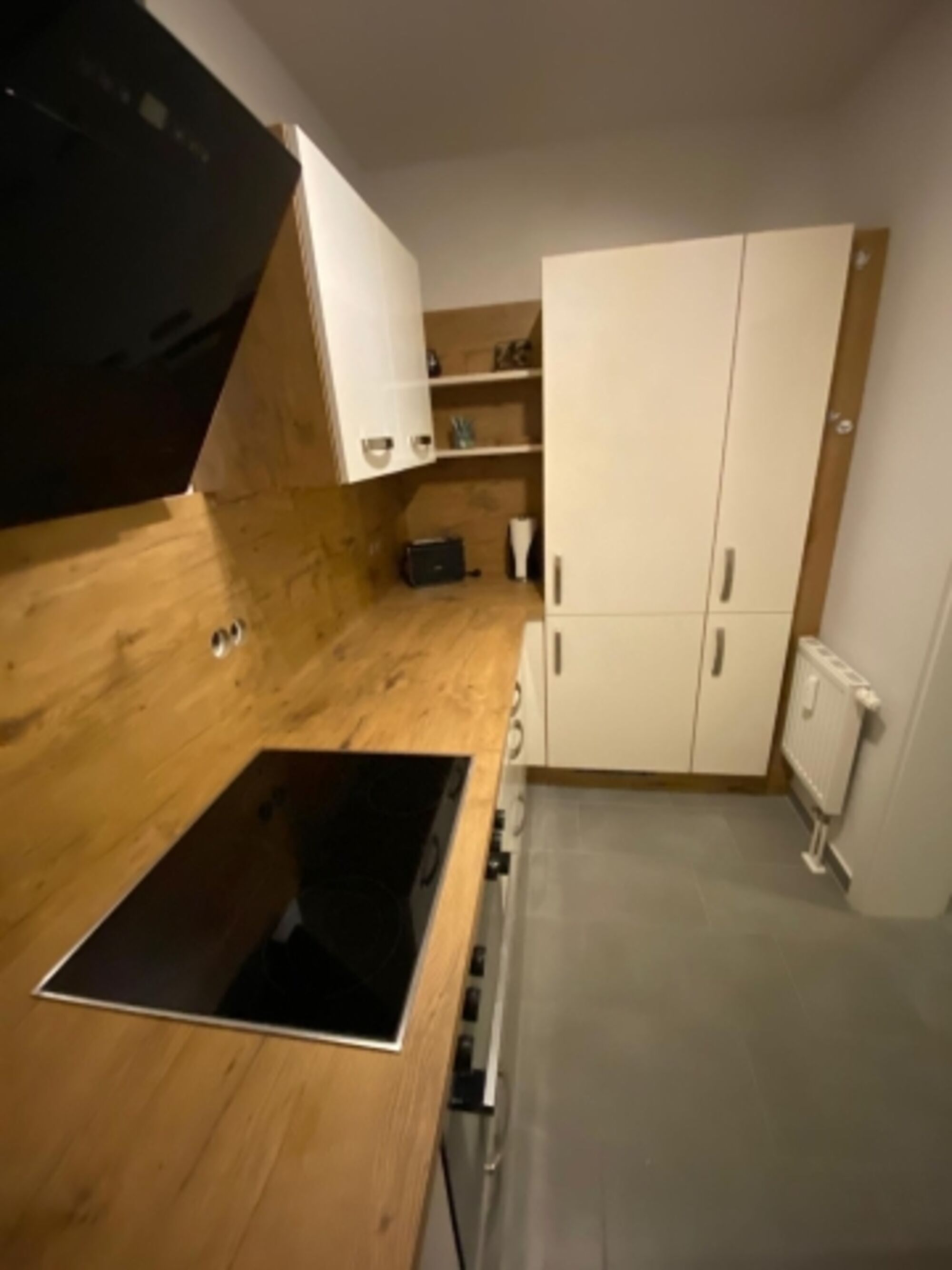 Auf der unteren Ebene (4. Etage) befindet sich der Eingang zur Wohnung, das Wohn- / Esszimmer, die voll ausgestattete Küche sowie das Gäste-WC.