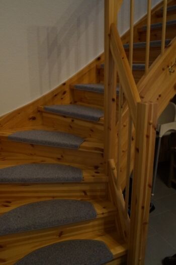 Über eine geschlossene Holzreppe (mit Teppichstufen belegt) gelangt man in die obere Ebene (5. Etage). Hier befinden sich die 2 Schlafzimmer sowie das Duschbad.