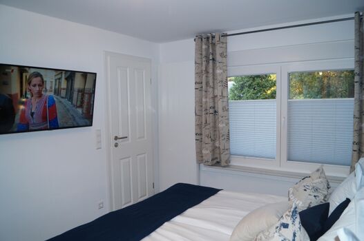 kleiner Bungalow - direkt am Waldrand gelegen, eingezäuntes Grundstück - Höhe 1,80m, max. 2 Personen, 4 kleine oder 3 kniehohe oder 2 große Hunde willkommen, 1 Wohn- / Esszimmer mit offener, voll ausgestatteter Küche, 1 Schlafzimmer, 1 Duschbad mit Waschtrockner, 750 m zum Strand - direkt durch den Wald