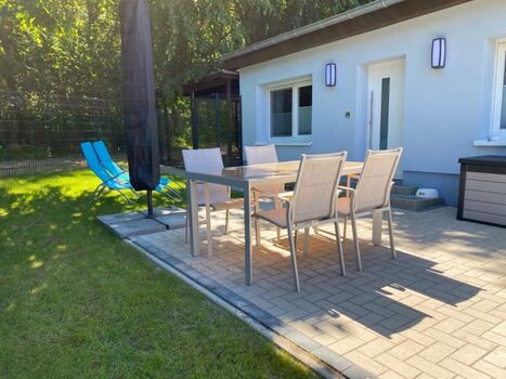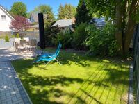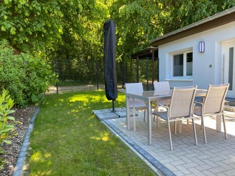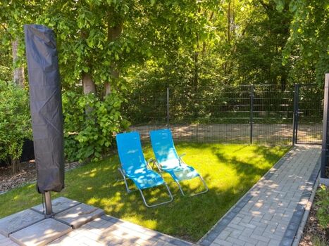 Der etwa 350 m² große Garten ist rundum 1,80 m hoch eingezäunt. Terrassenmöbel und Grill stehen zur Verfügung.