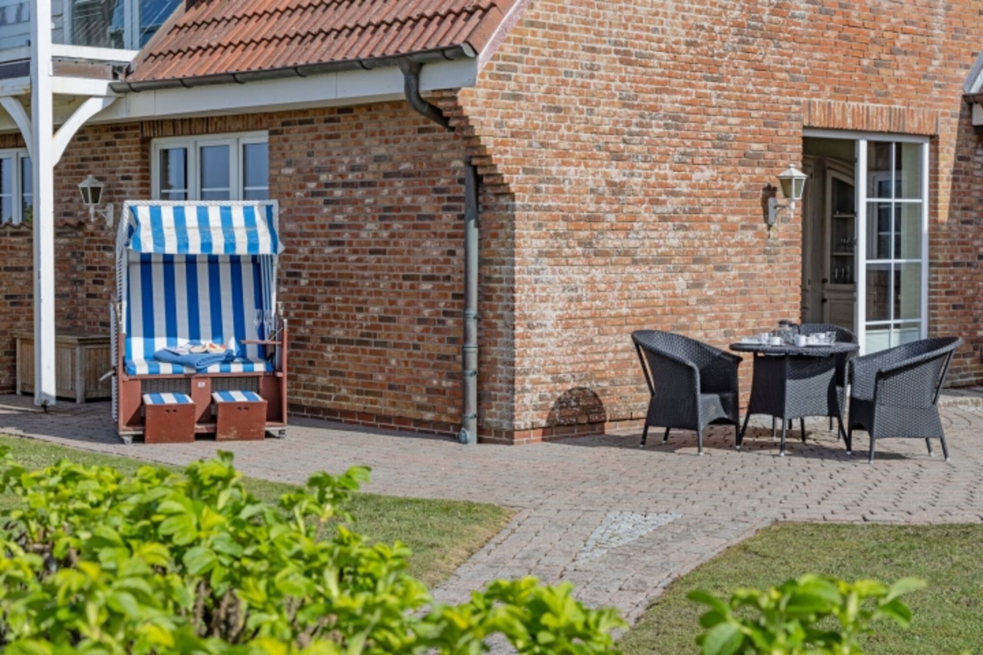 Helles Appartement mit kleiner Terrasse und Strandkorb im Erdgeschoss