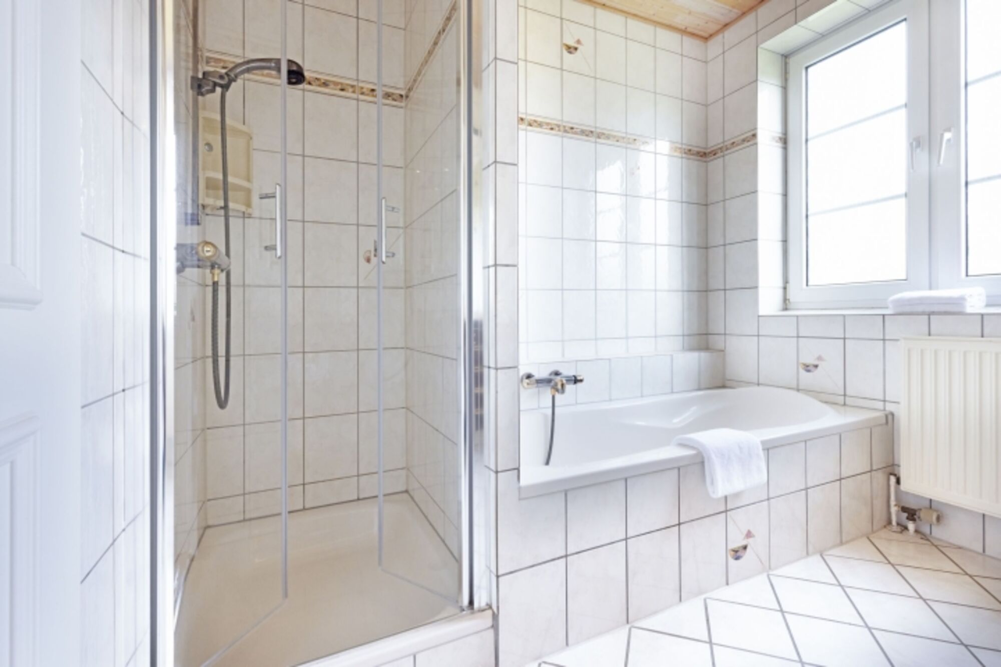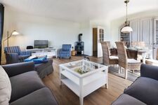 Die 114m² große, gemütlich eingerichtete Ferienwohnung hat ein Wohnzimmer mit Holzkamin und Essbereich, eine separate Küche mit Essplatz sowie drei Schlafzimmer mit Doppelbett. Außerdem verfügt das Appartement über zwei Badezimmer, eins mit Dusche und Badewanne sowie ein weiteres Duschbad.