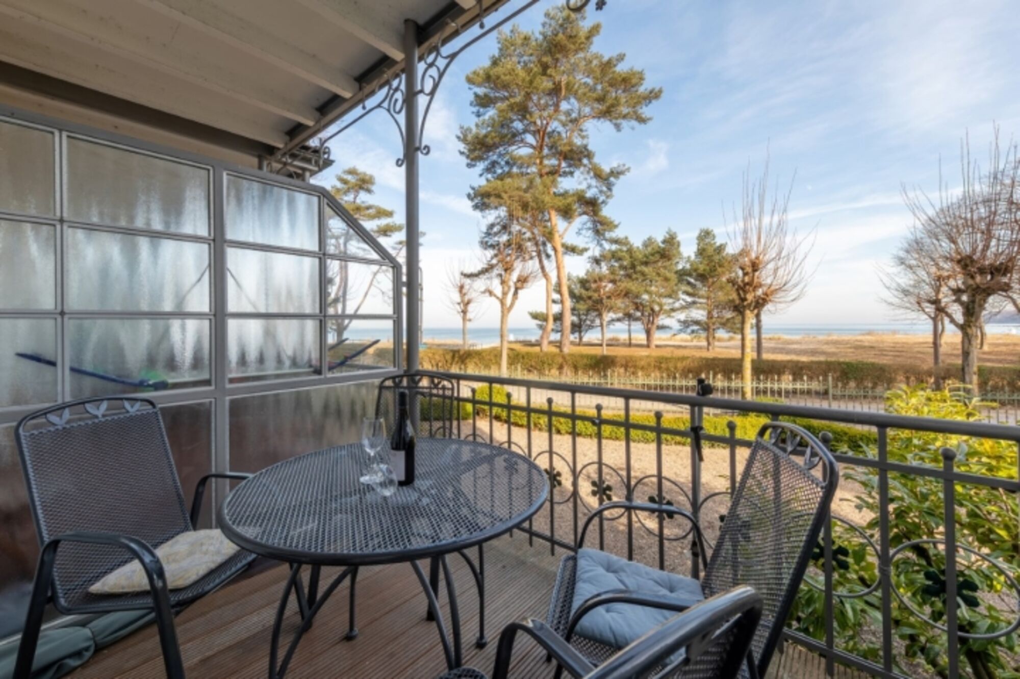 Der möblierte Balkon mit direktem Meerblick ist vom Wohnzimmer aus begehbar.