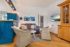 Das große helle und hochwertig möblierte Wohnzimmer mit TV und Stereoanlage hat eine voll ausgestattete Küchenzeile mit Cerankochfeld, Mikrowelle, Geschirrspüler, Backofen, Kühlschrank mit Eisfach, Wasserkocher, Toaster und Kaffeemaschine und einen großzügigen Eßplatz im Erker mit Meerblick. Sowohl vom Wohnzimmer als auch vom Eßplatz im Erker geniessen Sie den zauberhaften Seeblick.