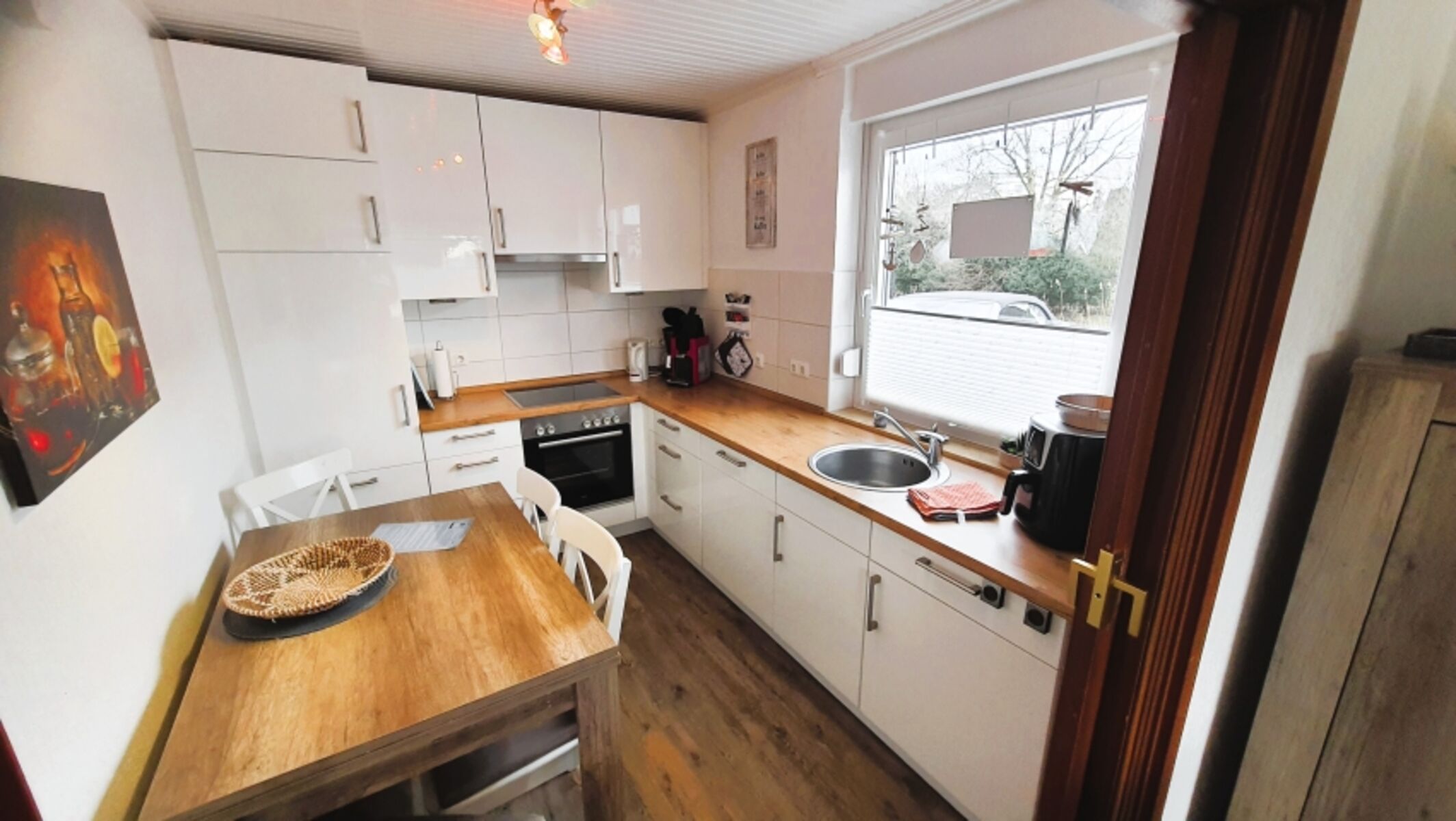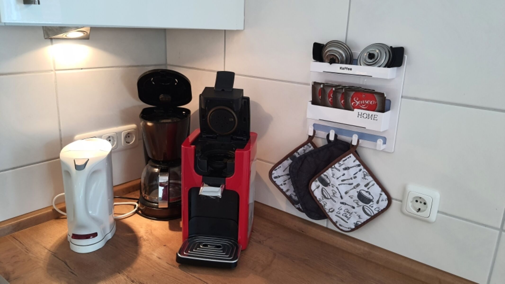 Cerankochfeld, Dunstabzugshaube, Kühlschrank mit Gefrierfach, Senseo-Kaffeeautomat, Eierkocher, Küchenmaschine, Mixer, Korkenzieher / Flaschenöffner, Gewürze (Salz, Pfeffer, Zucker), Öl / Essig, Geschirrhandtücher, Mülltüten, Essplatz in der Küche
