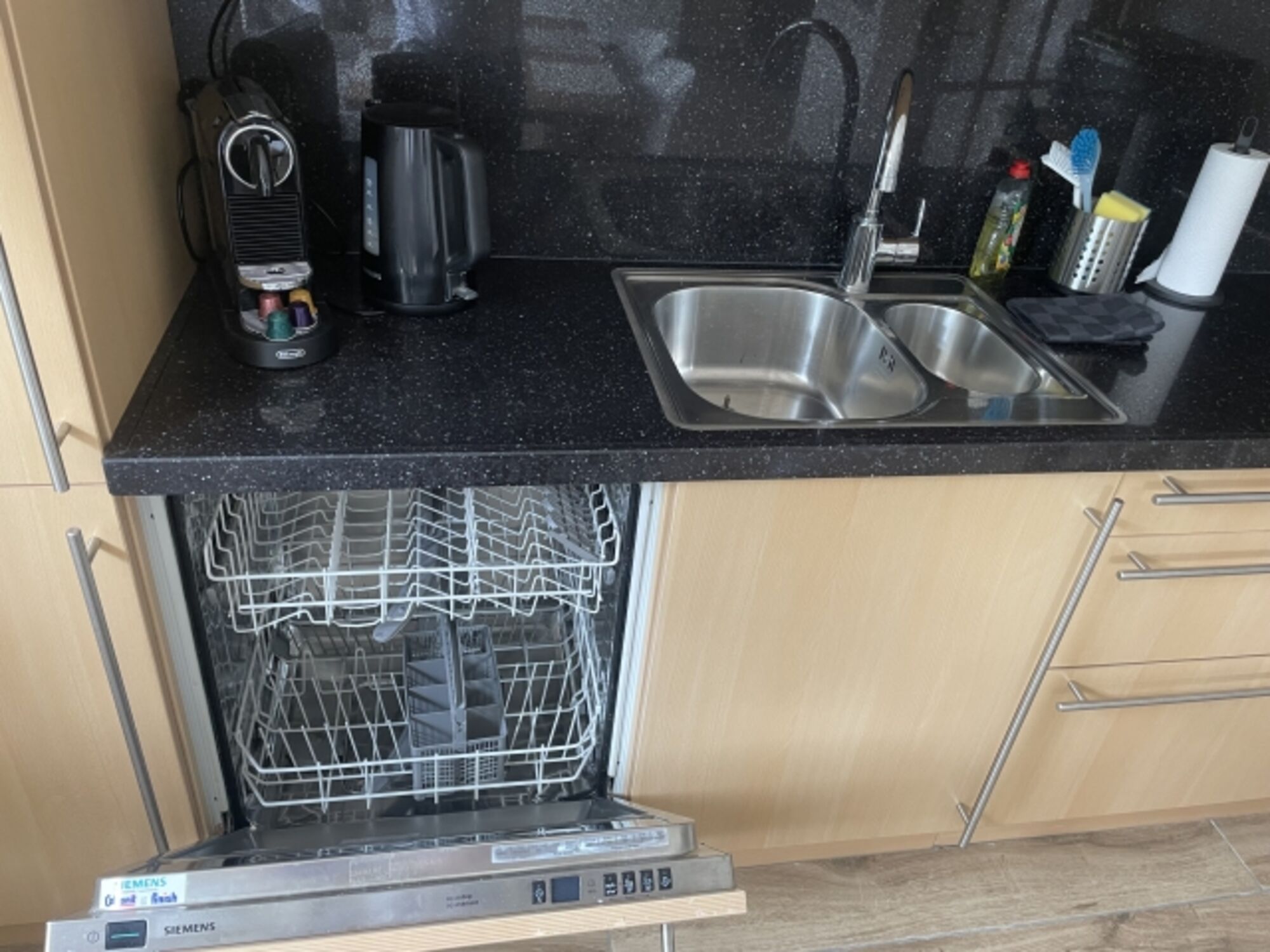 Die Küche ist gut ausgestattet mit einer Spülmaschine, Kochfeld, Backofen, Mikrowelle, Senseo Kaffeemaschine und einen Kühlgefrierschrank. Die Arbeitsplatte ist aus Granit.