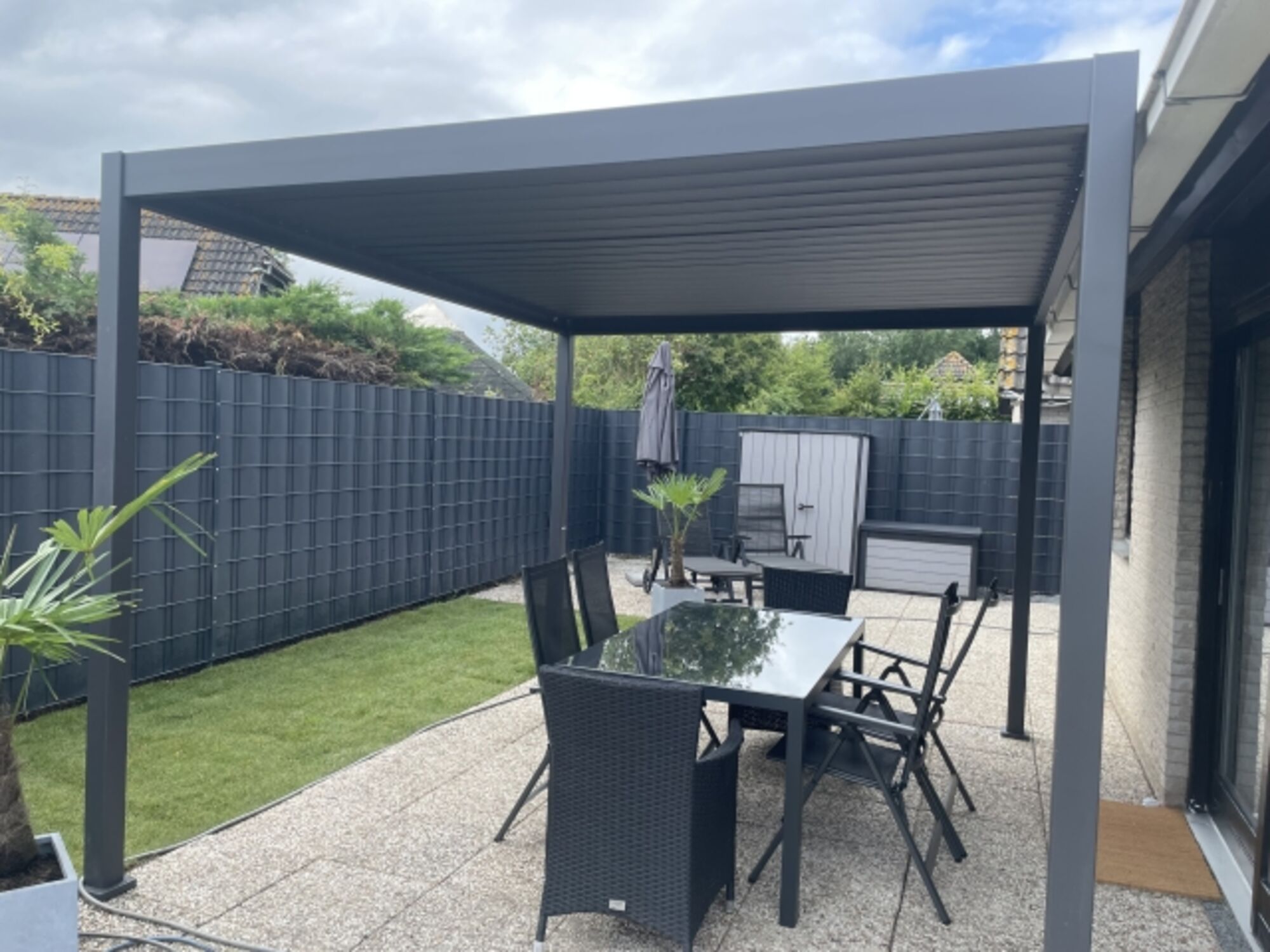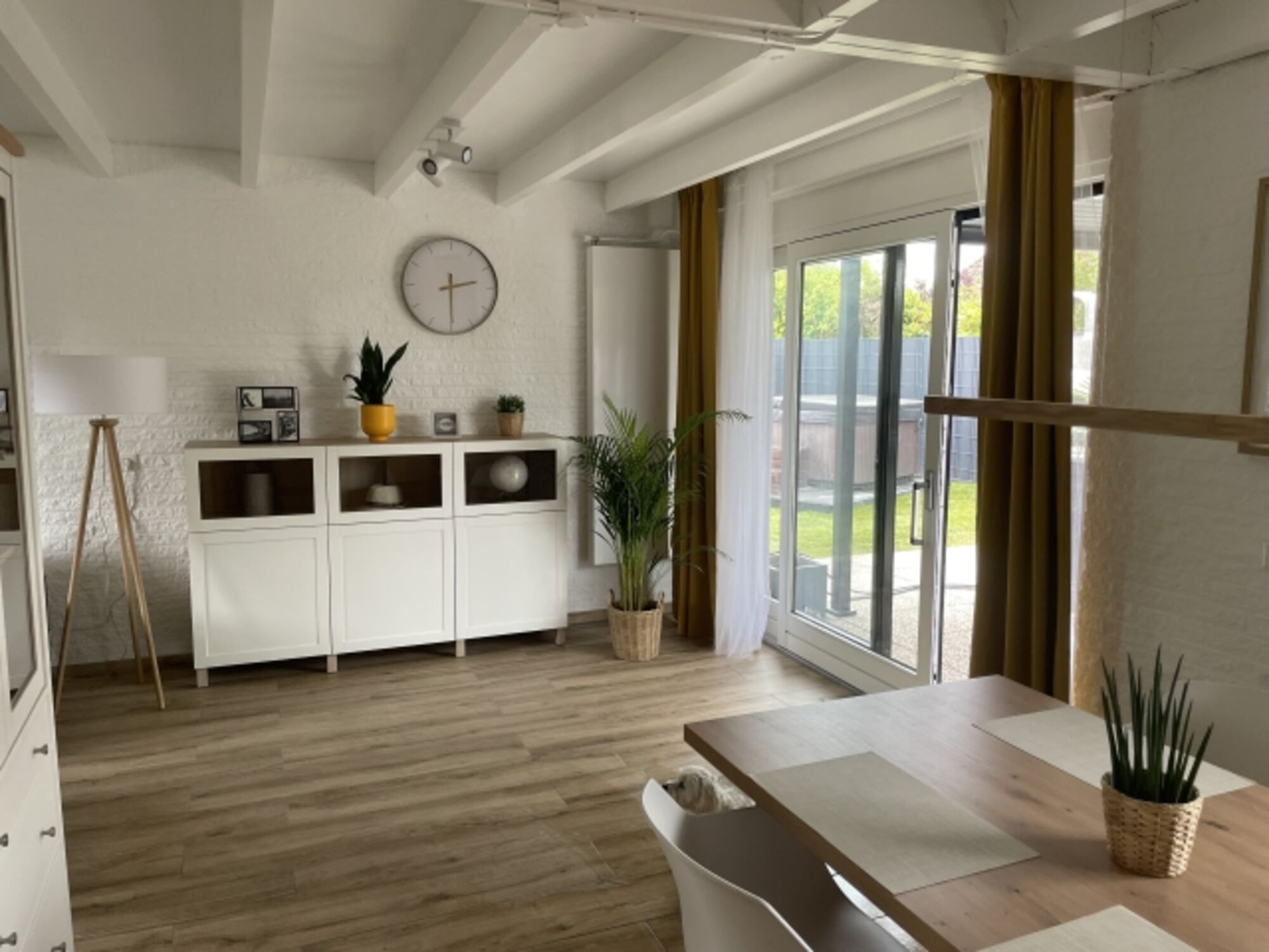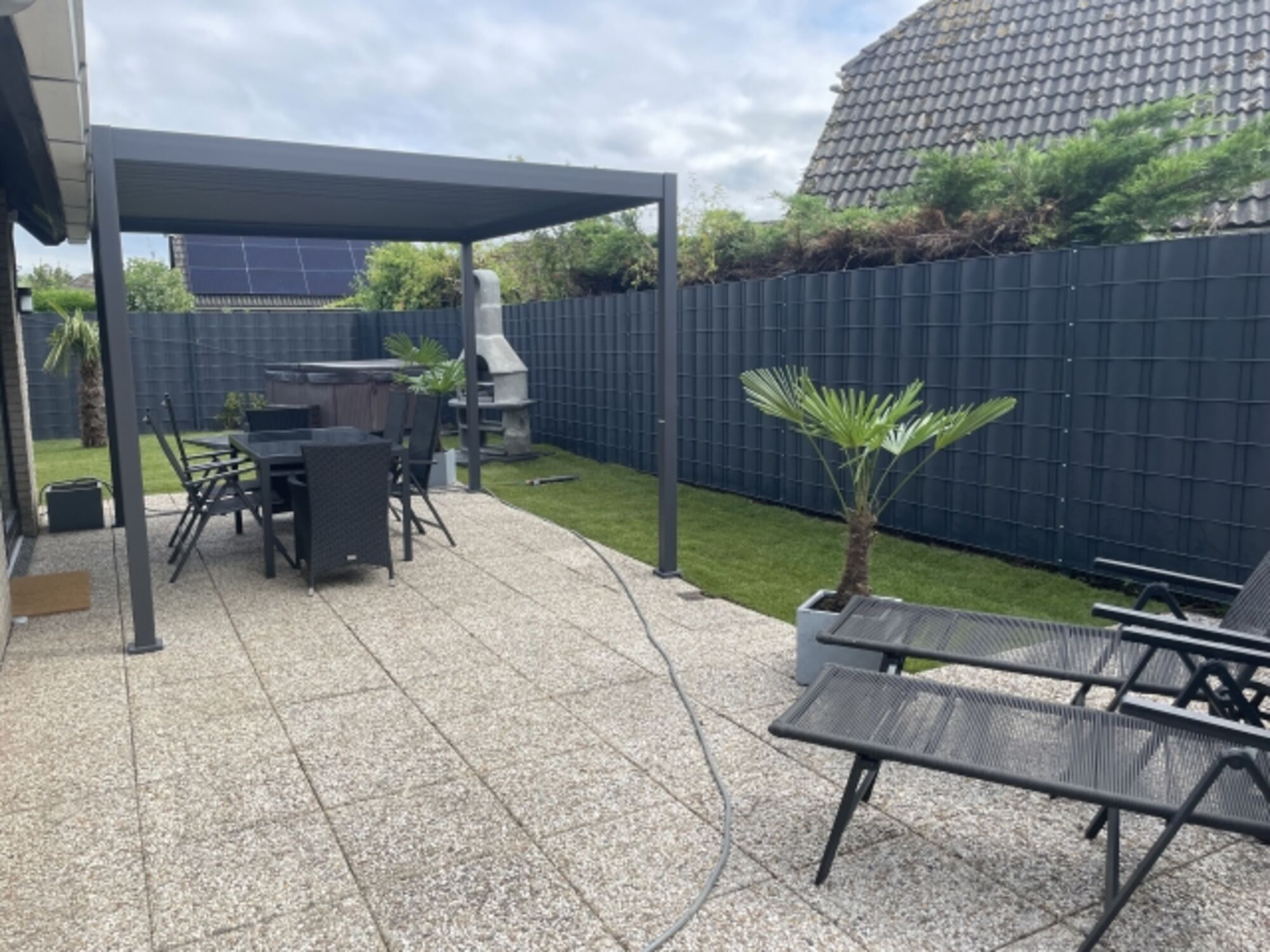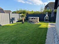 Der Garten ist ausreichend groß, komplett ab dem eingezäunt und abschließbar, mit einer großen Rasenfläche, einer überdachten Terrasse, inklusive zwei Liegen mit sechs Stühlen und einem Tisch. Der Whirlpool ist innerhalb der Sommerferien nur nach Rücksprache nutzbar.