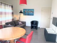 Das Wohnzimmer hat einen Essbereich und eine Sitzecke mit Sofa, 2 Einzelsesseln und TV.