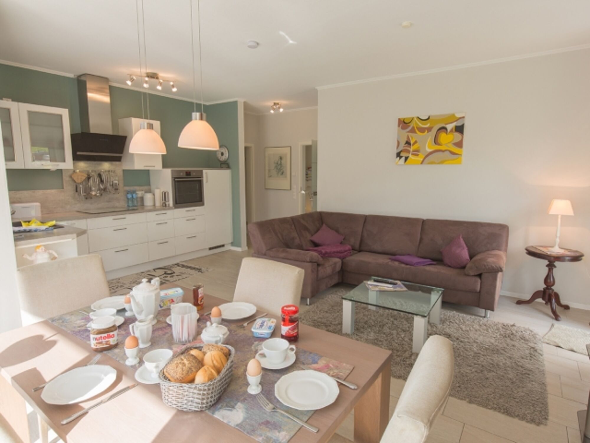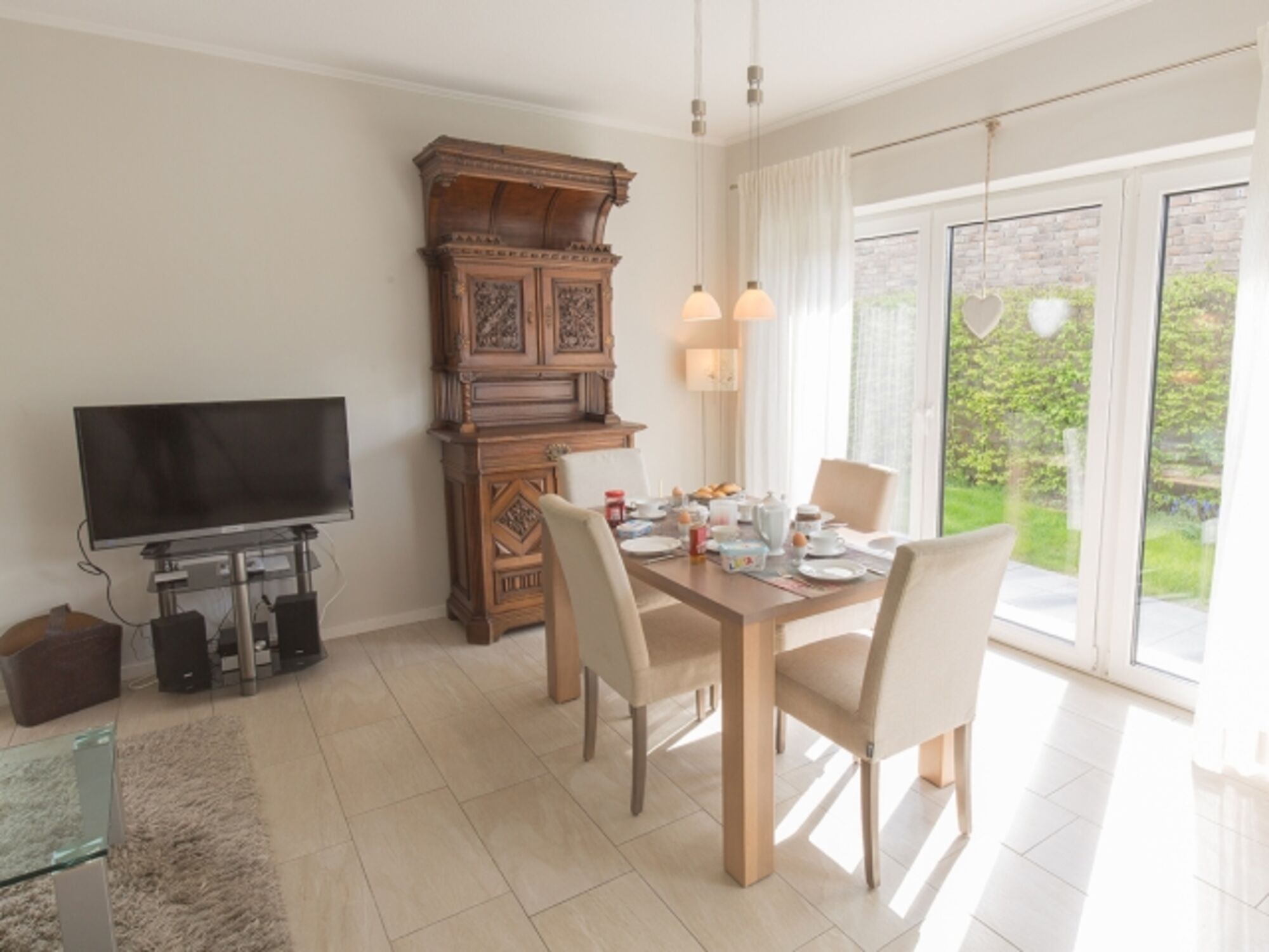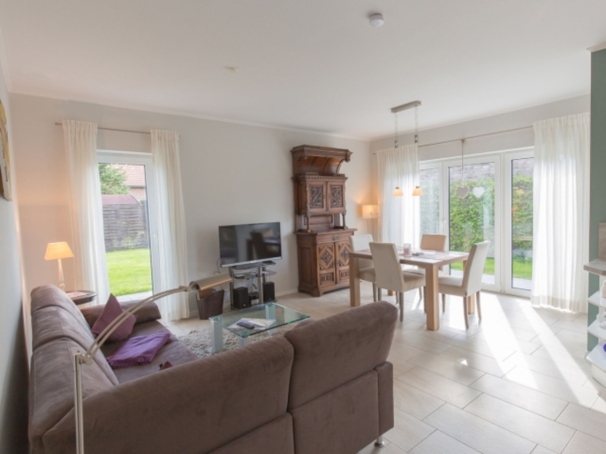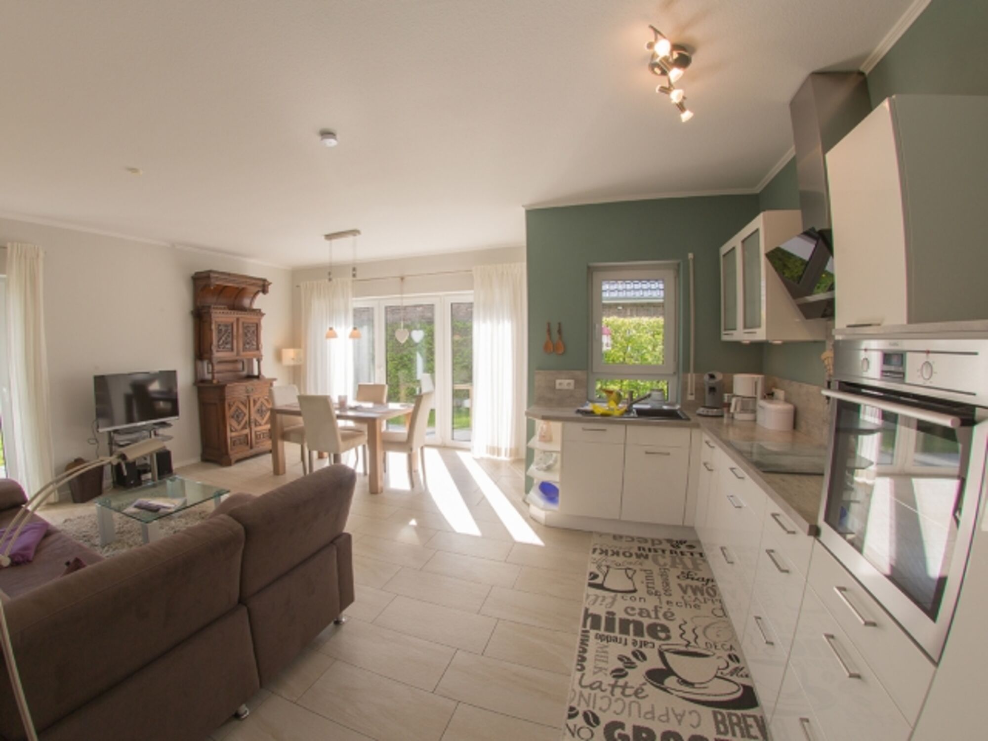 Sie parken direkt vor dem Haus - eine Garage und weitere 2 Stellplätze sind vorhanden. Durch den hellen Dielenbereich gelangen Sie in das lichtdurchflutete Wohnzimmer mit integrierter L-Küchenzeile und dem Essplatz mit Ausgang zu den beiden Terrassen und der großen Liegewiese mit Strandkorb.