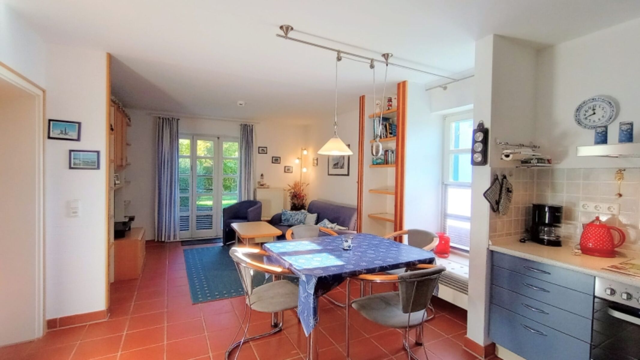 Freundlich gibt sich das Wohnzimmer mit gut ausgestatteter Einbauküche. U.a. finden Sie hier einen Kühlschrank mit Gefrierfach, einen Geschirrspüler und einen Backofen. Einbaumöbel und zeitloser Terracotta-Boden sorgen für Behaglichkeit. Im Schlafzimmer finden Sie ein Doppelbett mit guten Matratzen, im Wohnzimmer ein Sofa, das sich zum 1,40m breiten Bett ausklappen lässt.