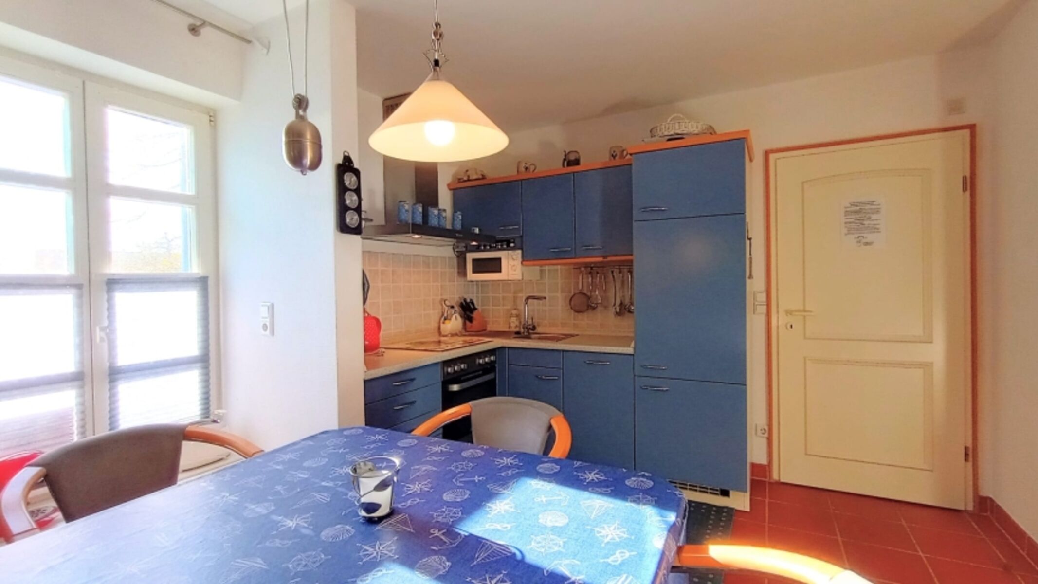Cerankochfeld, Kühlschrank mit Gefrierfach, Korkenzieher / Flaschenöffner, Essplatz in der Küche