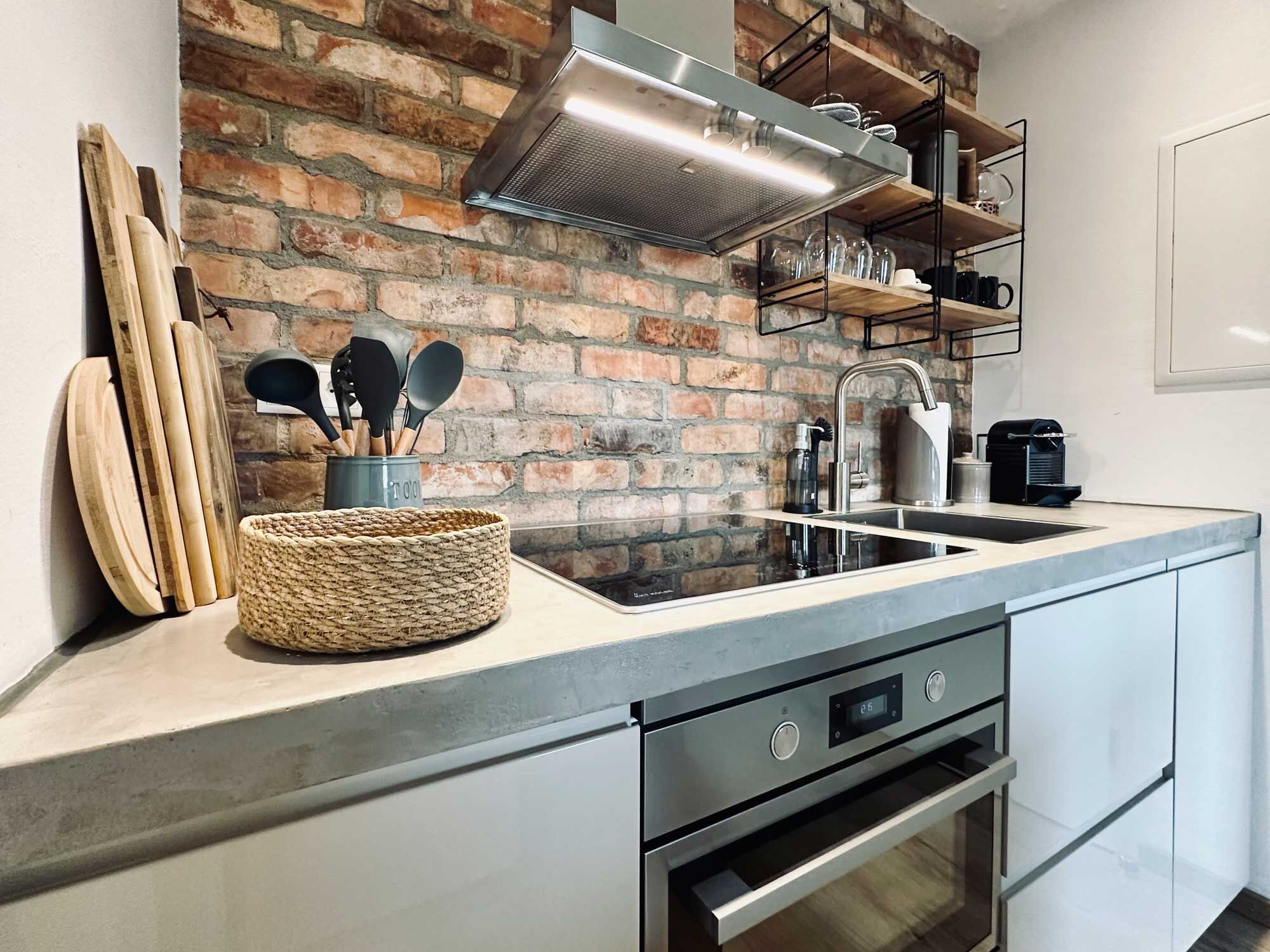 4-Platten Induktionskochfeld, Dunstabzugshaube, Kühlschrank mit Gefrierfach, Nespresso-Automat und Filter-Kaffeemaschine, Korkenzieher/Flaschenöffner, Geschirrhandtücher, Mülltüten, Essplatz