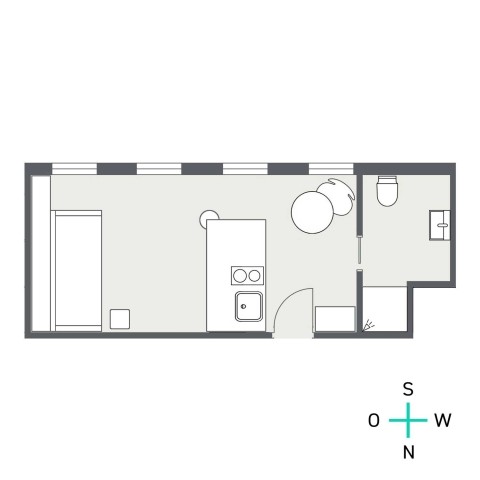 Mit etwa 20 qm ist unsere Wohnung Nr. 5 die kleinste unter unseren Ferienwohnungen, aber sie hat es in sich! Der zentrale Punkt des "tiny loft" ist die große Kücheninsel, an der man auch wunderbar sitzen kann. Die Küche ist mit einem 2er-Induktionskochfeld und einer Mikrowelle ausgestattet, perfekt für kleine Mahlzeiten. Daneben ein kleiner Essbereich mit gemütlichem Sessel.