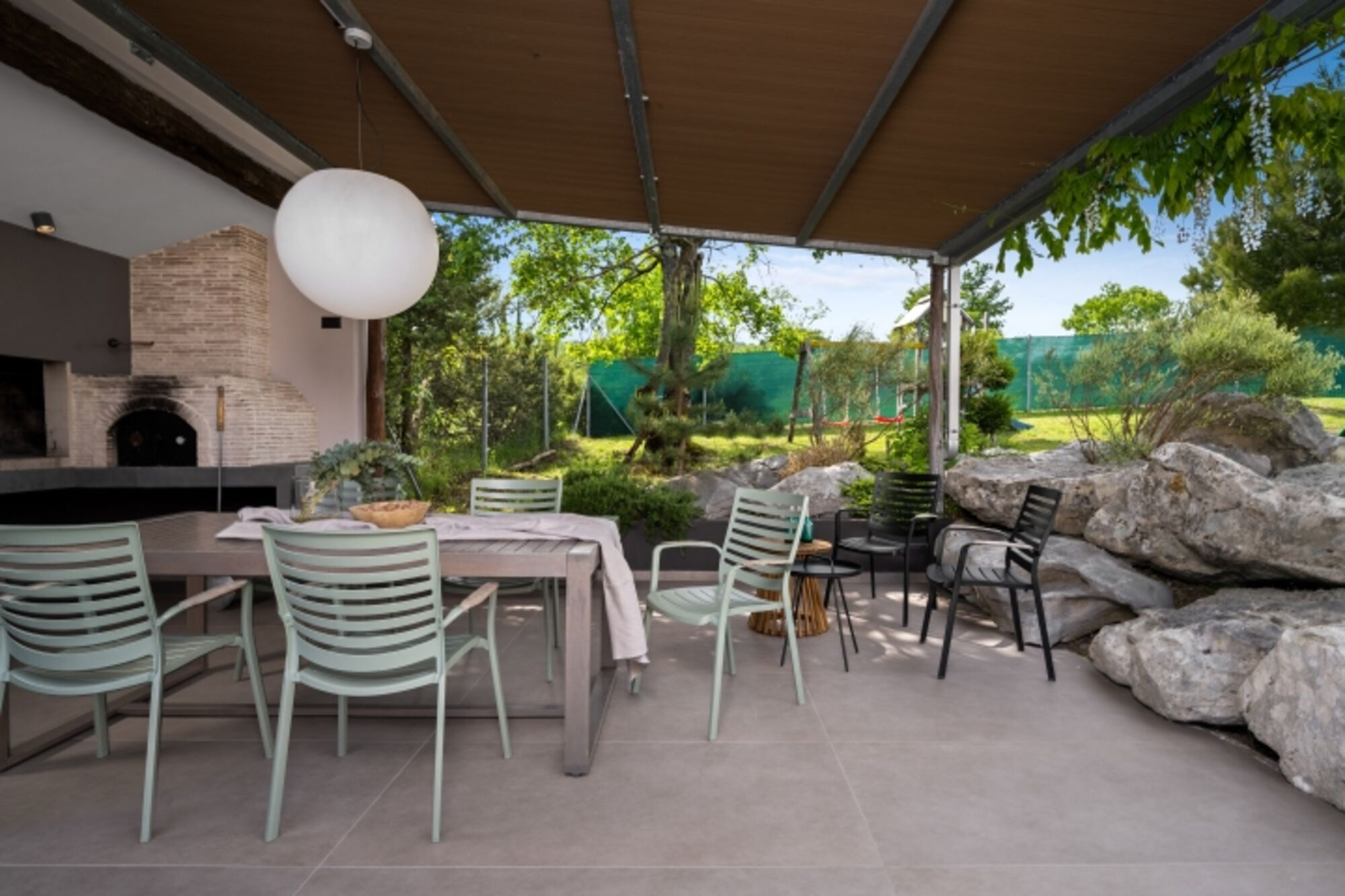 Liegewiese, Gartenmöbel, Kohlegrill, Holzgrill, Außenkamin, Markise
